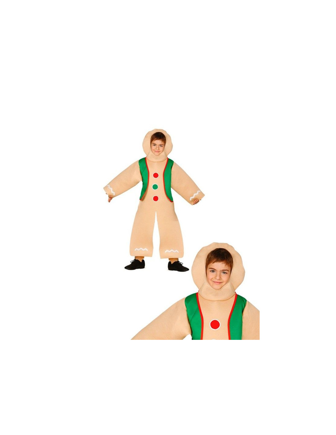 Disfraz de Galleta de Jengibre infantil para que tu peque sea el/la más dulce de la fiesta de Navidad. Incluye un mono color crema con los detalles de los botones sobre el mismo, chaleco verde, ribetes rojos y capucha acolchada.