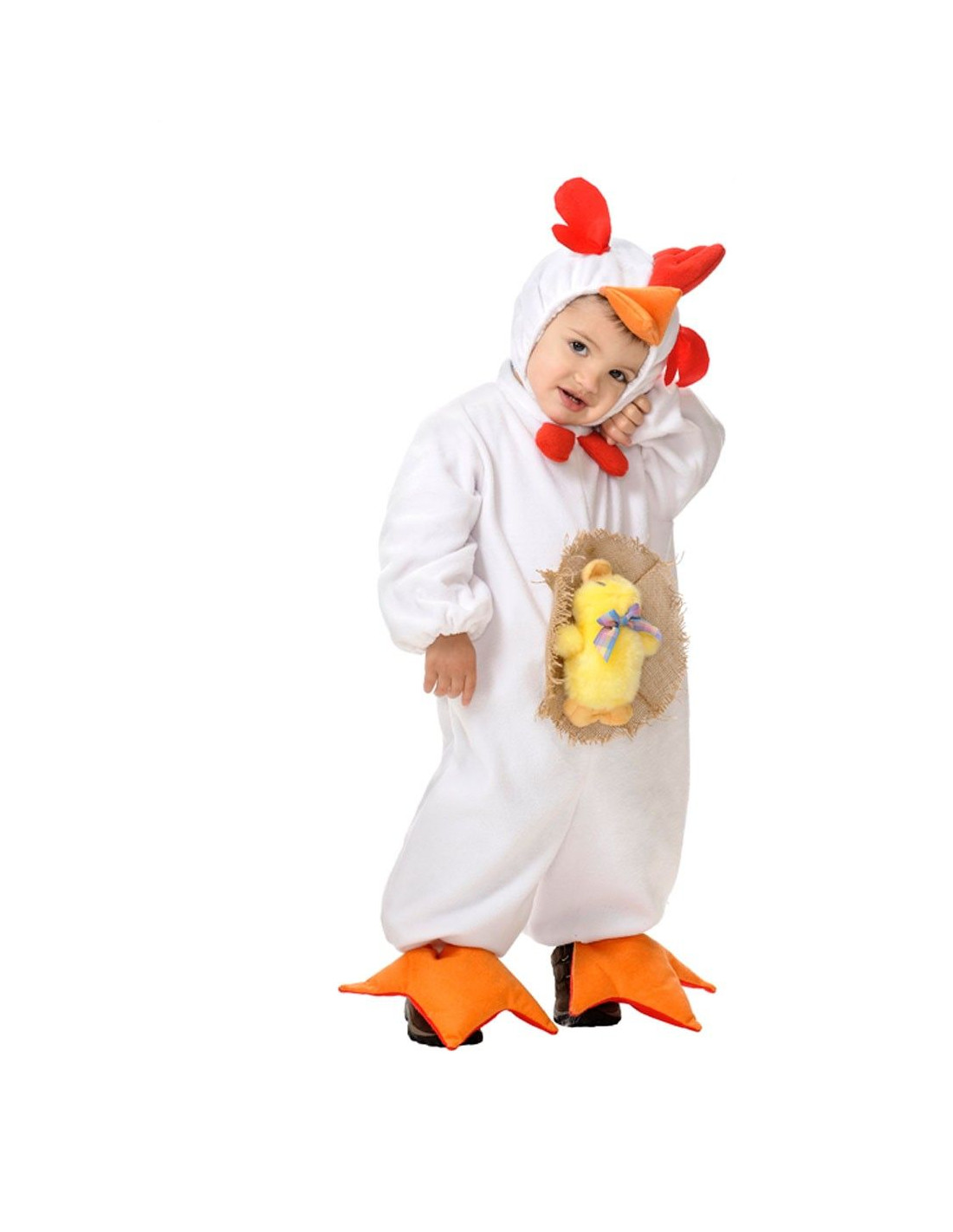 Disfraz gallina bebé que incluye cabeza y mono con pollito.