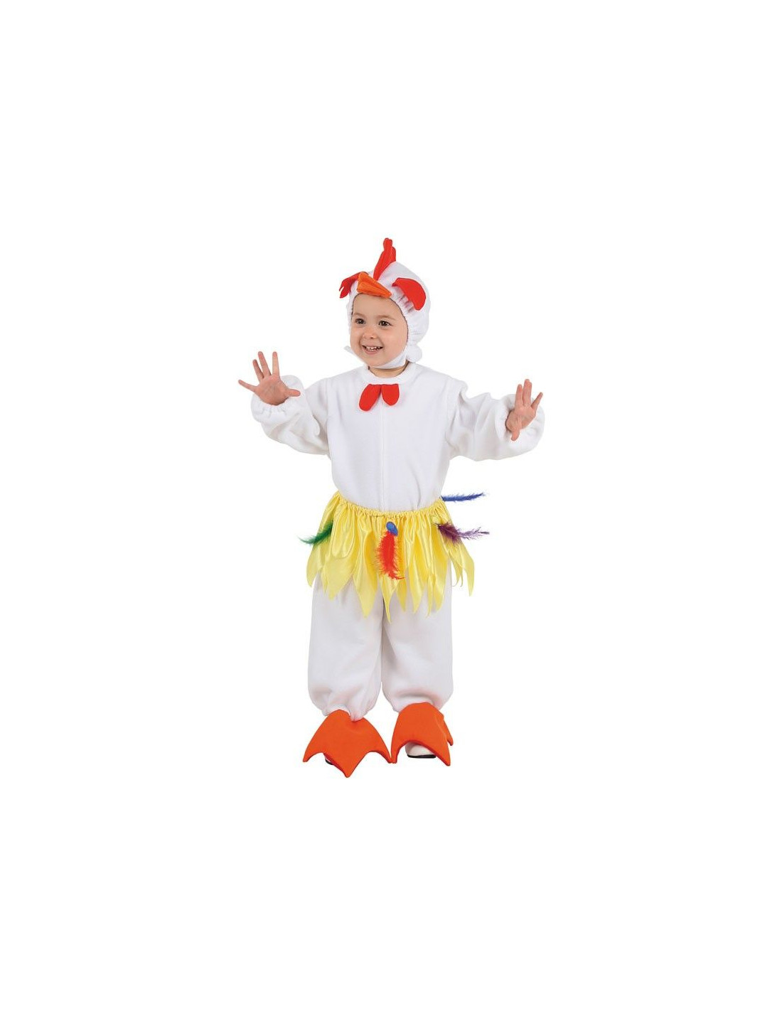 El disfraz de gallina bebé lleva un mono entero con patitas, gorro y una faldita con plumas de colores.