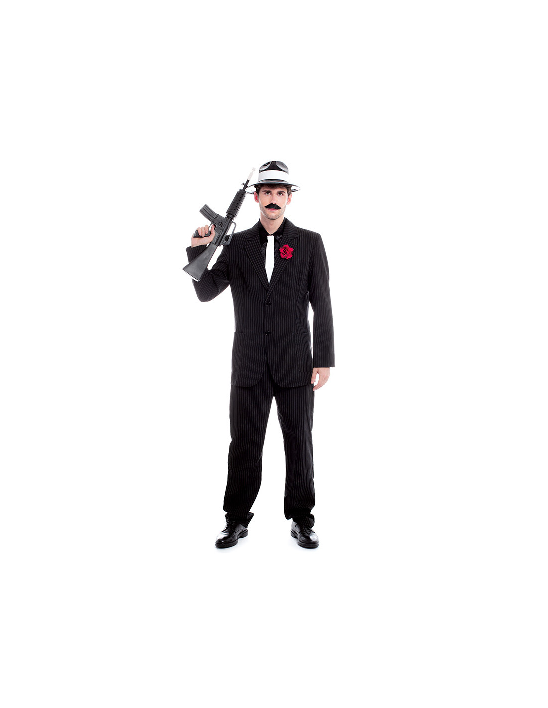 Disfraz gánster para adulto que contiene chaqueta, pantalón, camisa, corbata y flor. No contiene metralleta y sombrero.