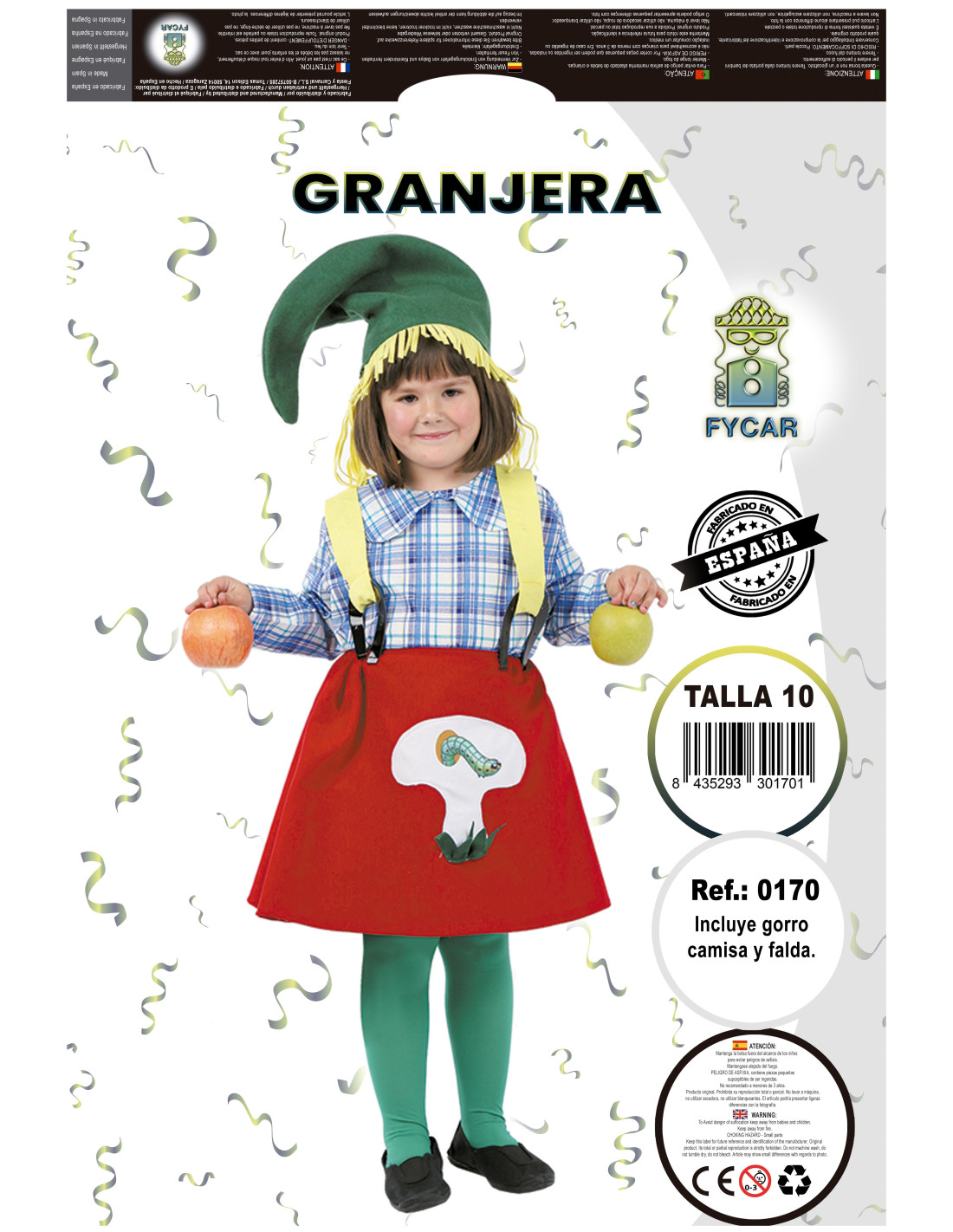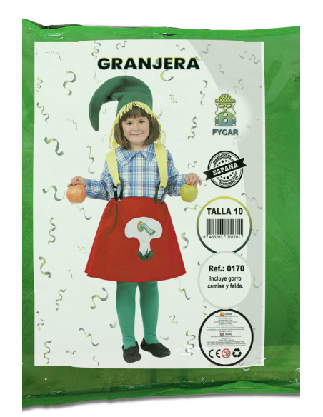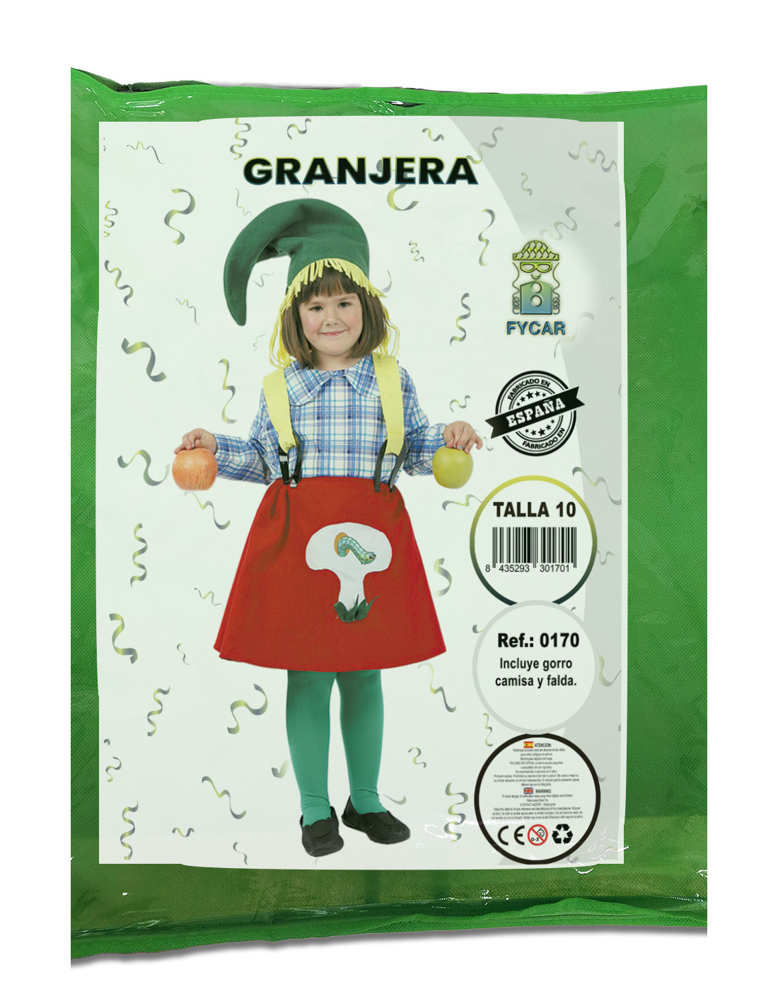El traje incluye gorro de fieltro, camisa de popelin a cuadros y falda roja decorada con motivo del bosque. Una trabajadora y linda grenjerita será tu pequeña con este disfraz de granjera para escenificar cuentos relacionados con trabajos o que se desarrollen en el bosque,