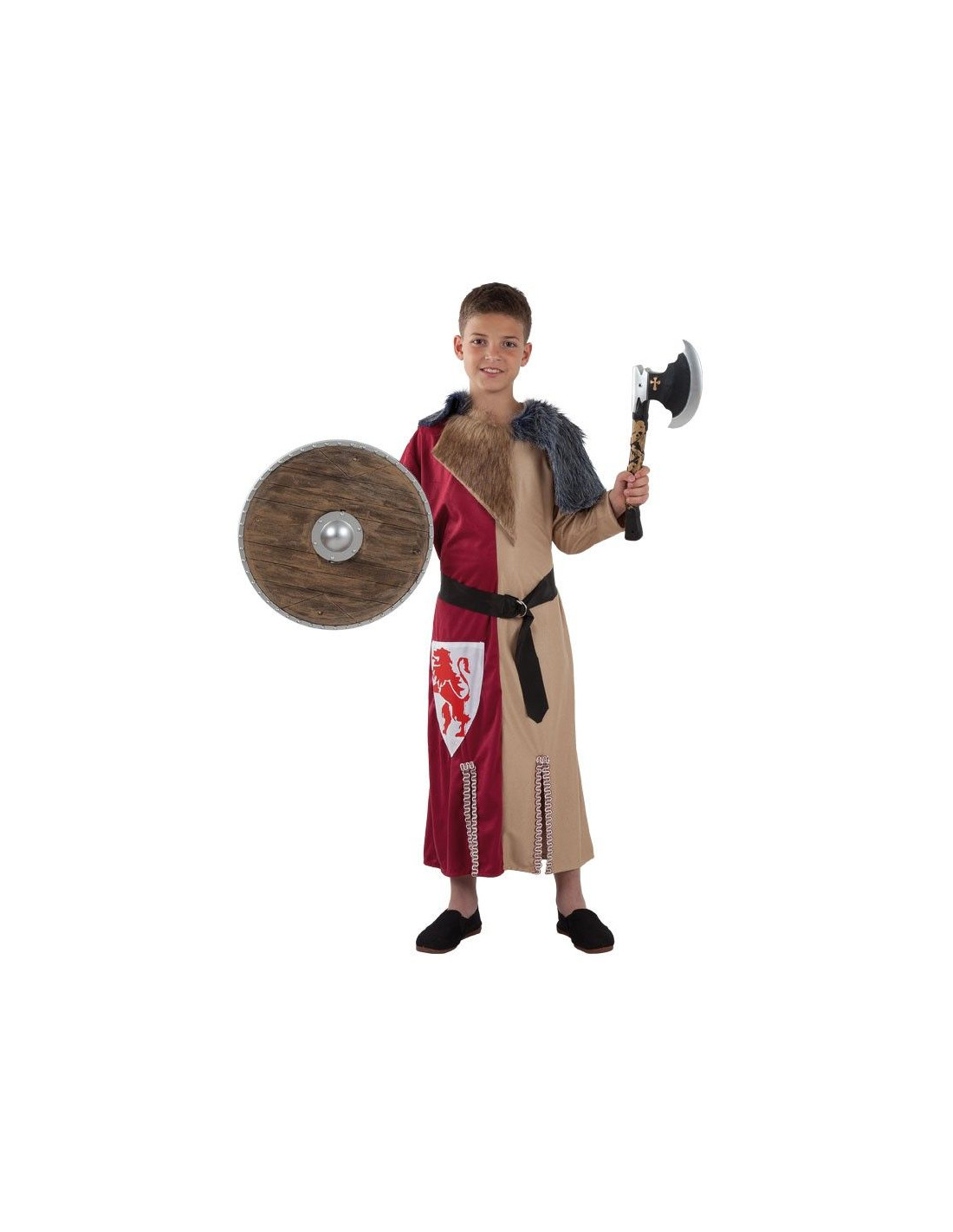 Disfraz de guerrero medieval niño ideal para Ferias medievales, Carnaval o representaciones teatrales infantiles del colegio. Incluye un disfraz de guerrero medieval niño, compuesto por una capelina de pelo en diversos colores túnica con aberturas bordeadas de pasamanería rustica y estampada con un león, y cinturón de polipiel. ¡Toma el castillo y rescata a la princesa!