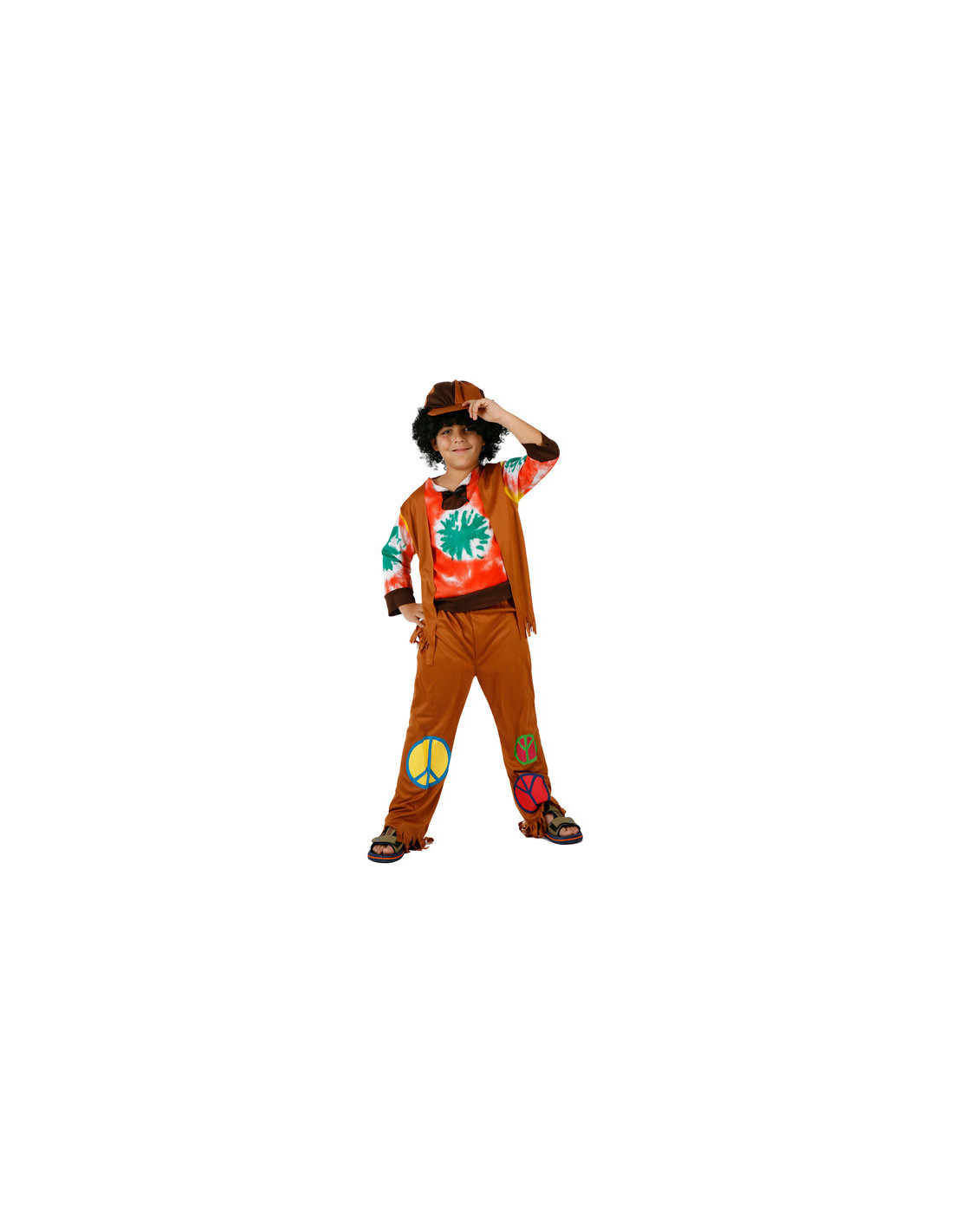 Disfraz hippie años 60 niño que incluye gorra, camiseta con chaleco y pantalón.