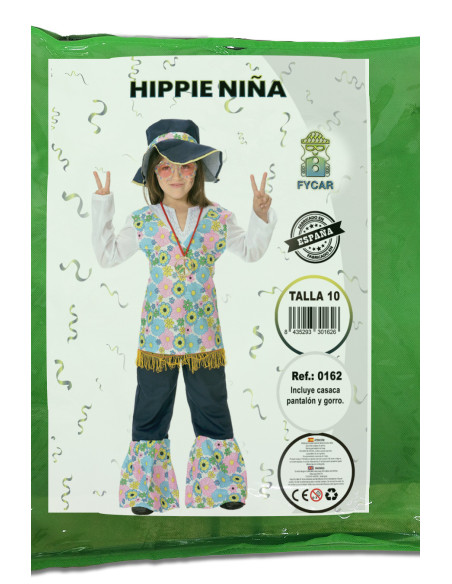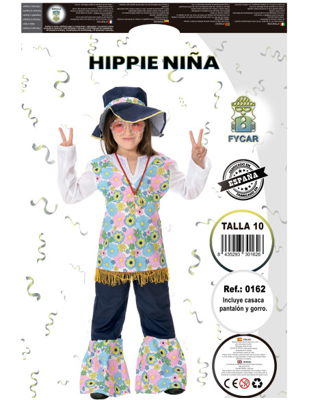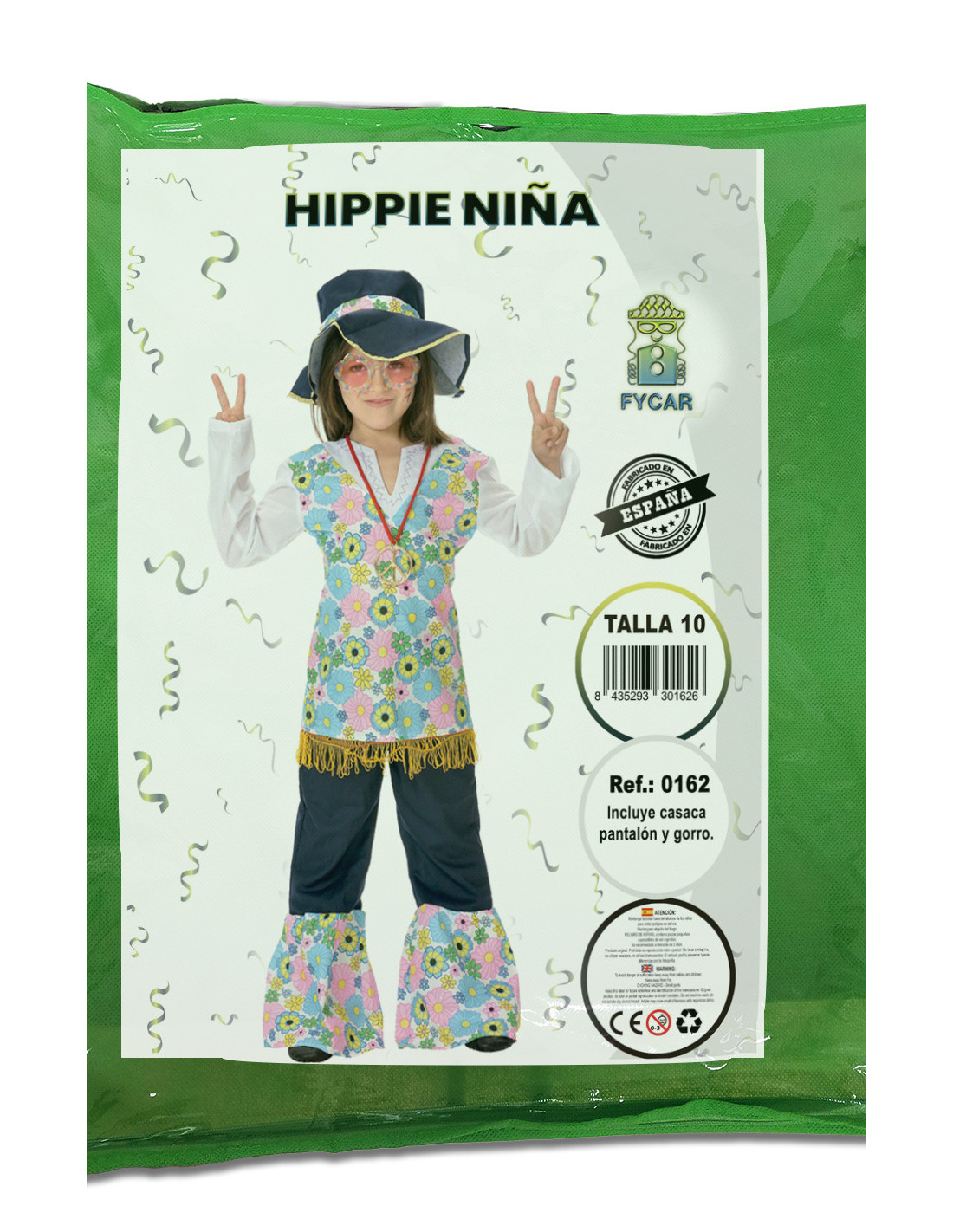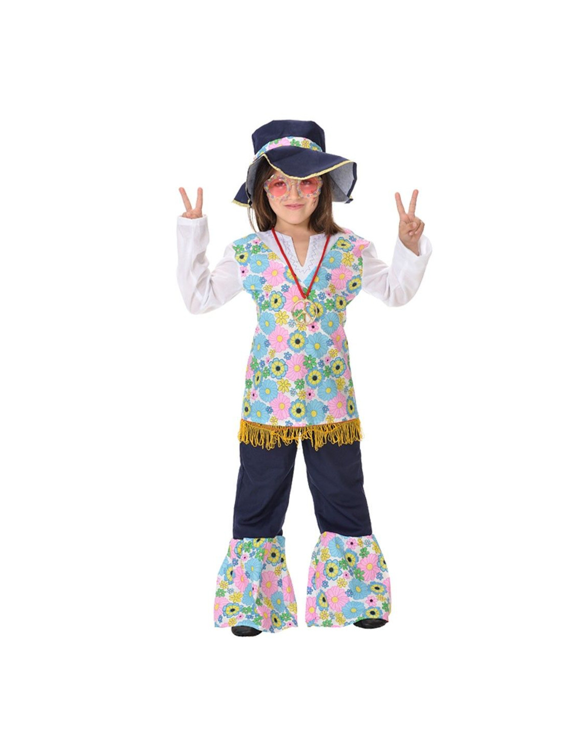 El traje incluye casaca de flores estampadas, pantalón negro con campana de flores estampadas y gorro Reparte paz y amor con este disfraz de hippie clasico de un movimiento pacifista desarrolado en los EEUU en la epoca de los 60-70. El traje es muy versatil y economico para representaciones de la epoca en los colegios