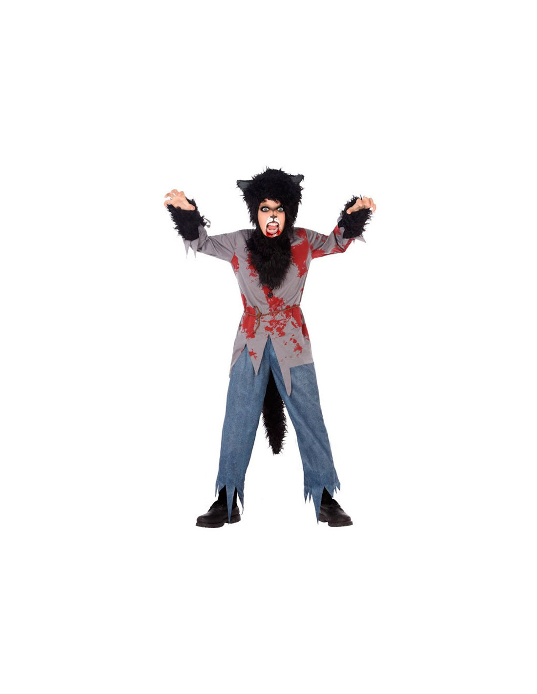 Disfraz hombre lobo infantil que incluye camiseta, pantalón, cinturón y gorro.
