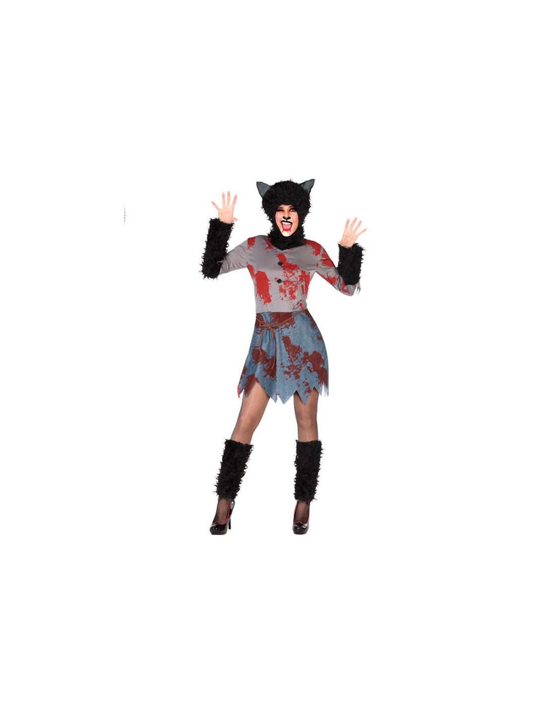 Este disfraz hombre Lobo para mujer contiene un vestido con manchas de sangre y pelo en las mangas, calentadores de pelo y una capucha de pelo con orejas.