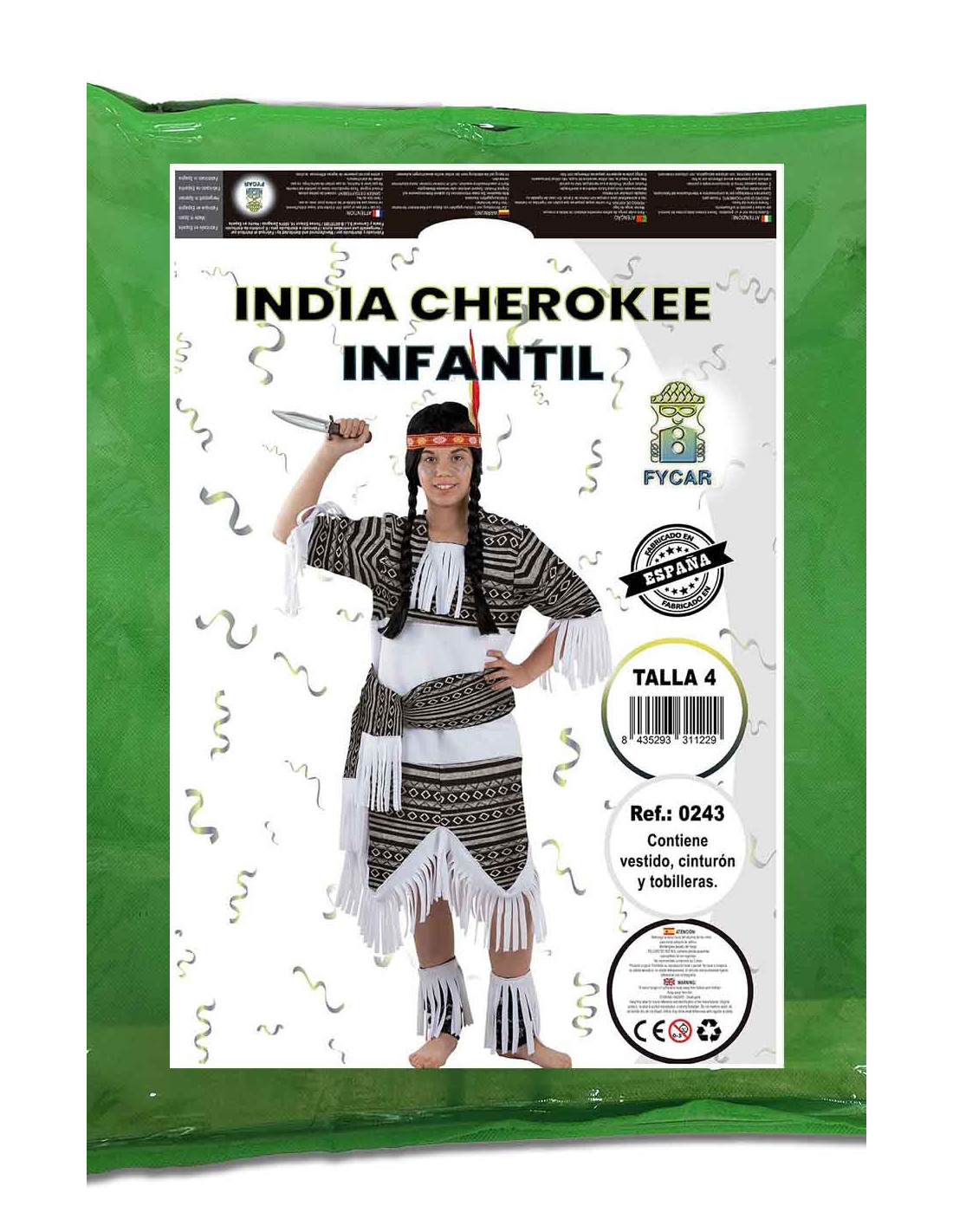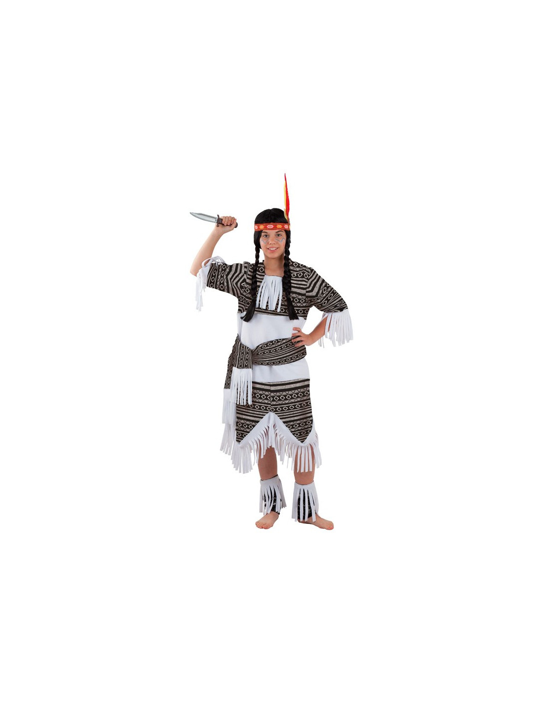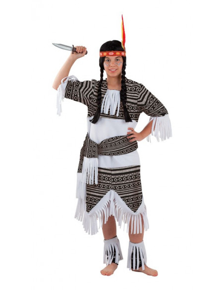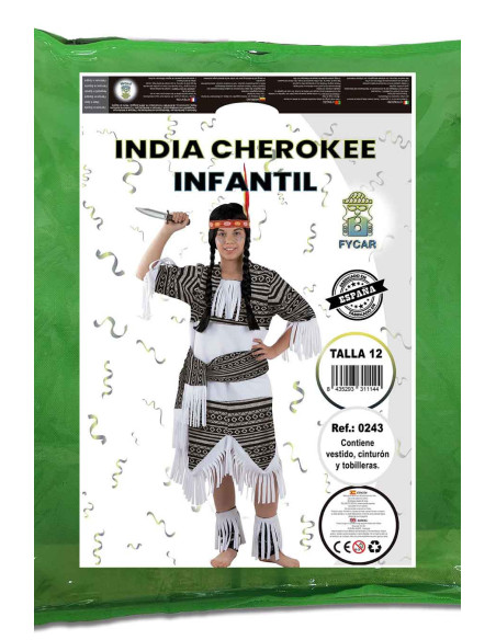 Este disfraz India cherokee para niña contiene vestido largo con flecos que combina tela blanca y estampada, cinturón y tobilleras estampado con flecos.