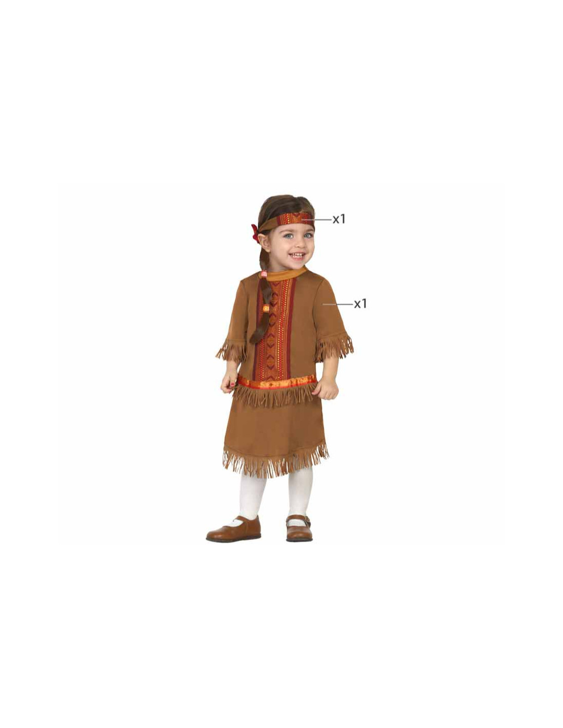 Este disfraz de nativo siempre será un éxito para cualquier fiesta. Trae un vestido con flecos y cenefas de temática indígena. Para la cabeza lleva una cinta que como sigue el mismo formato le quedará genial. No incluye medias y zapatos.