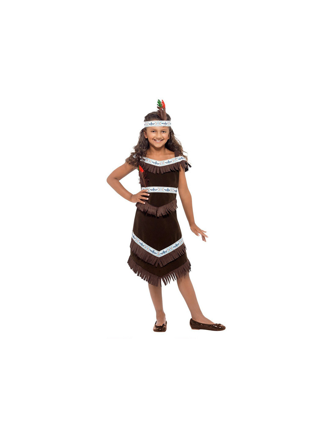 El disfraz india para niña contiene un vestido marrón con flecos y cinta para la cabeza con plumas.