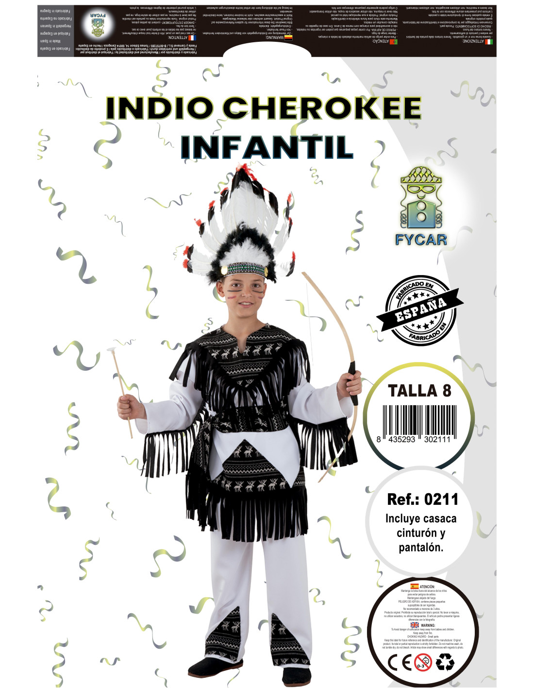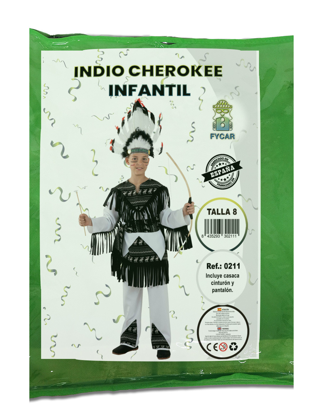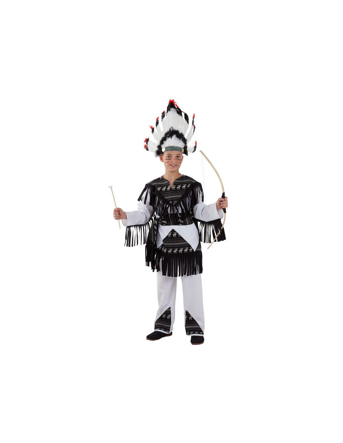 Incluye casaca y panalón blancos decorada con flecos de antelina negra y tejido de polar estampado y cinturón Disfraz indio cherokee para trasladar a los pequeños hasta el lejano Oeste. Ideal para fiestas temáticas y Carnaval o para jugar con tus amigos a indios y vaqueros