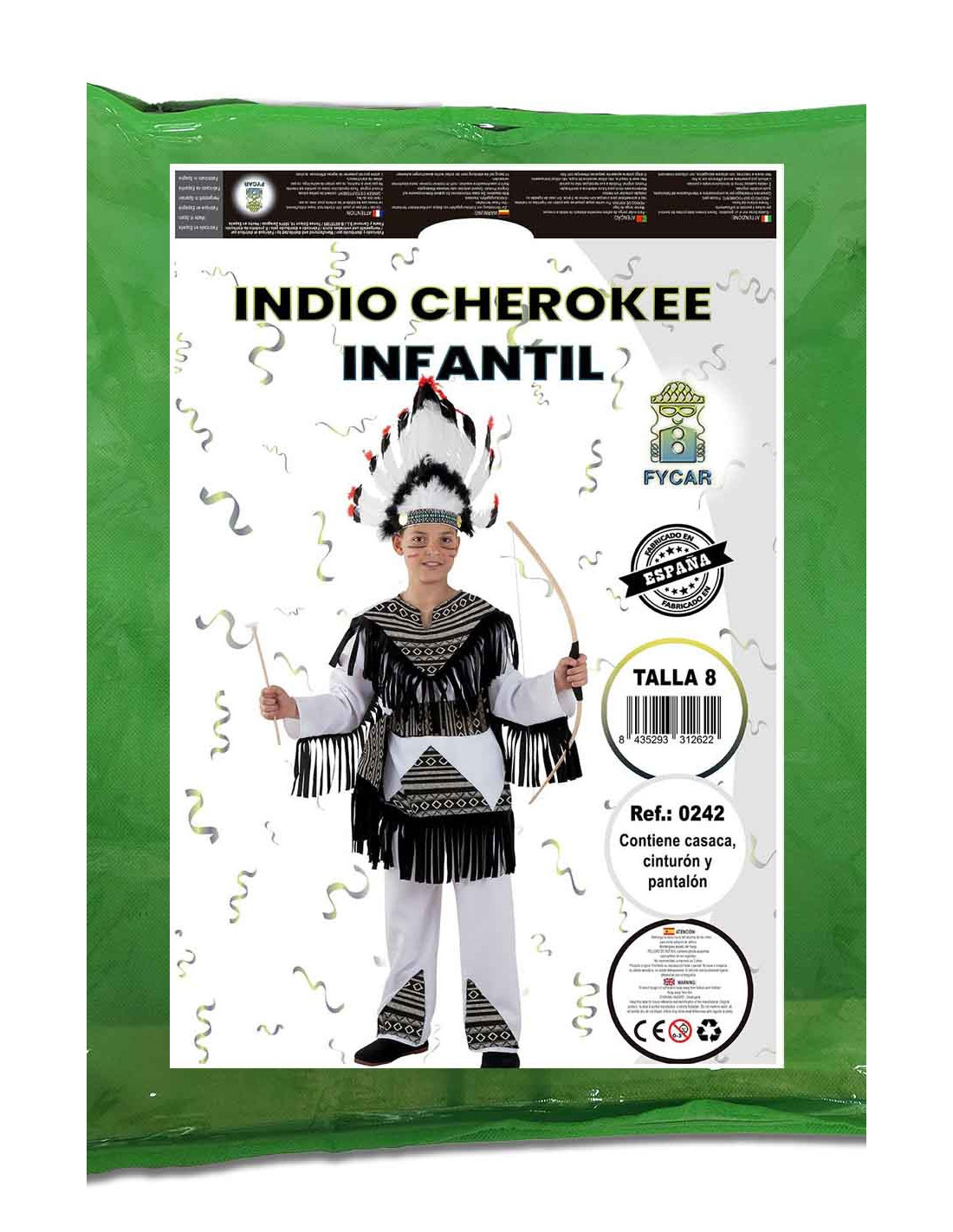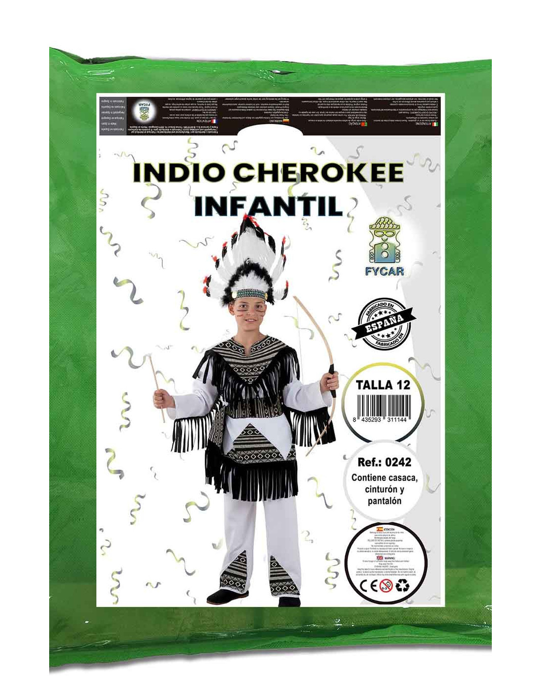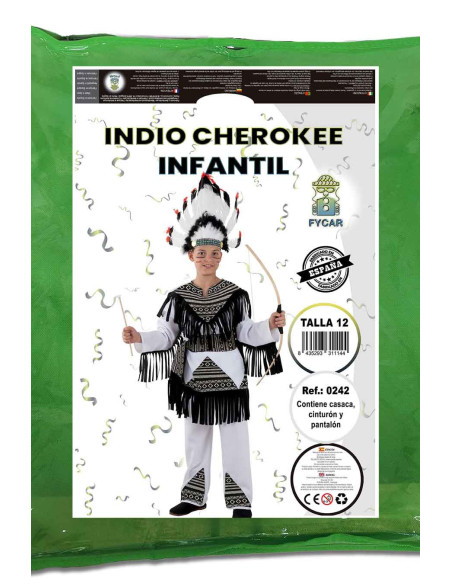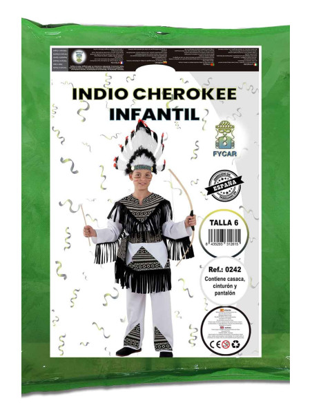 Este completo disfraz de indio cherokee para niños contiene una camiseta, pantalón y cinturón.