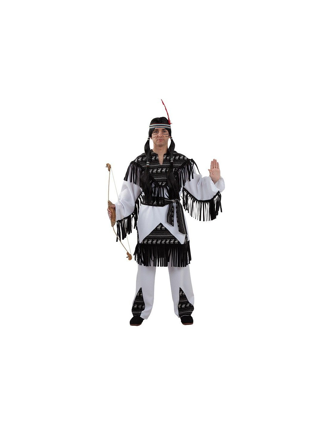Disfraz indio cherokee para hobmre que incluye casca de strech blanco decorado con fleco negro, en los bajos y en el pecho decorado con una tela negra y bordados renos, pantalon de strech blanco con detalles en los bajos al igual que la casaca y cinturon como los detalles del pantalon y casaca.