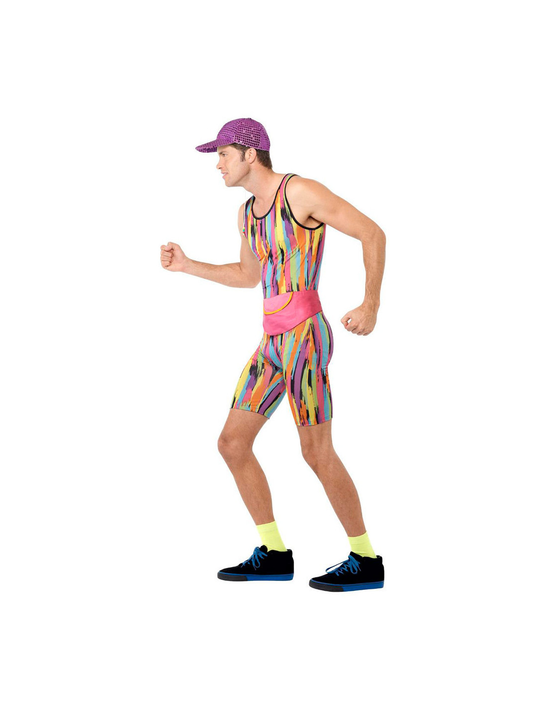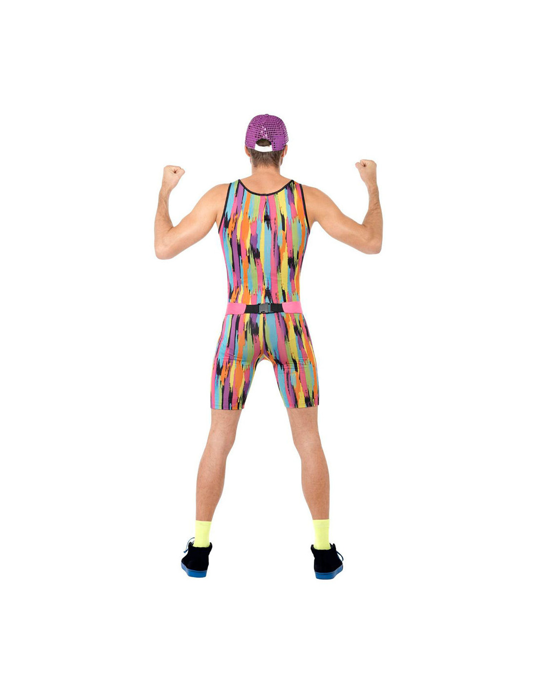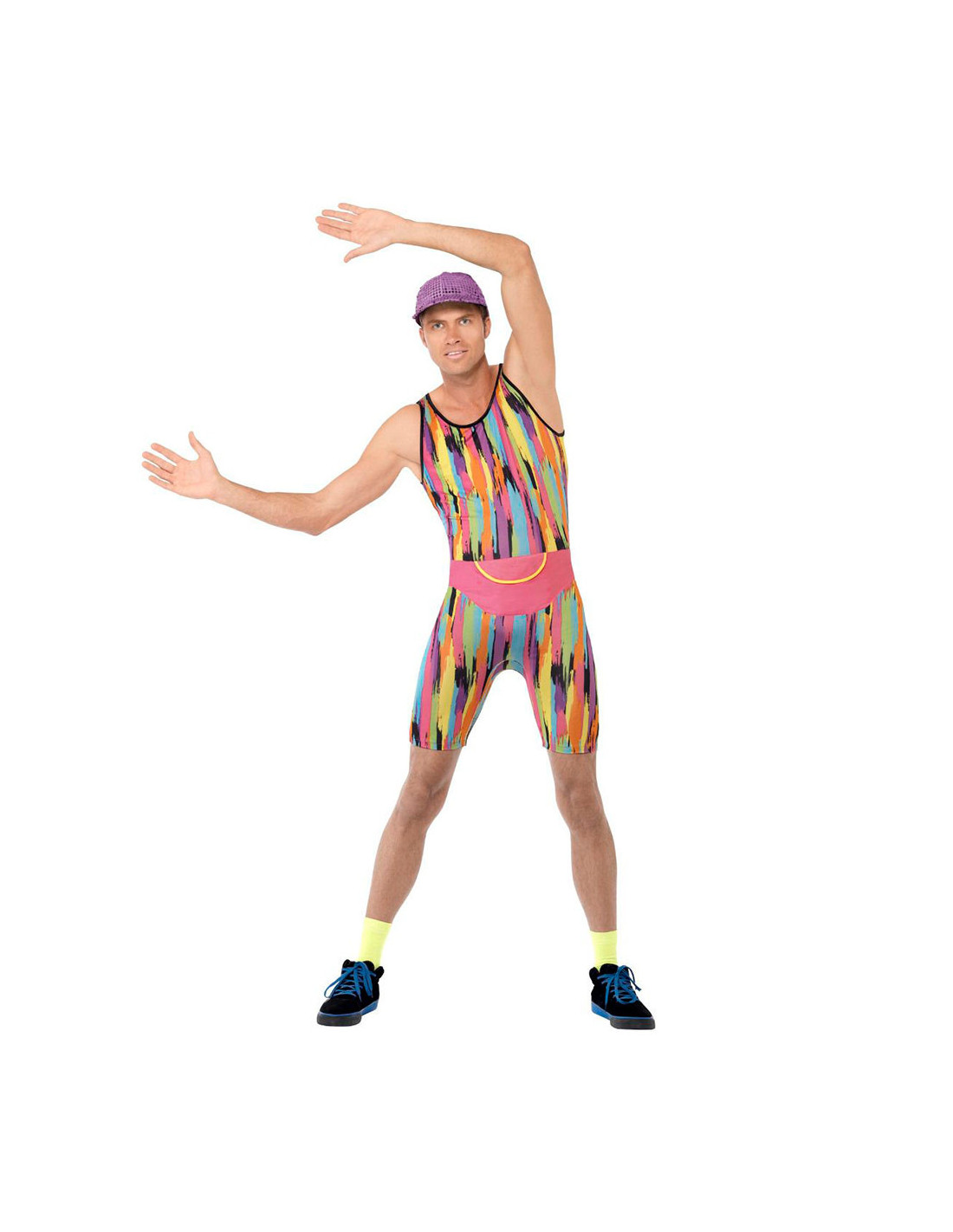 El disfraz instructor de aerobic 80s contiene una malla elástica de tirantes y pantalones cortos estampado en llamativos colores, gorra brillante morada y riñonera.
