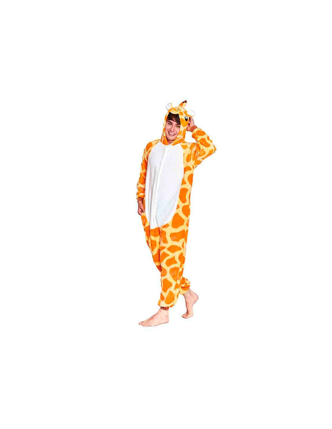 Disfraz jirafa kigurumi adulto unisex que incluye un mono de cuerpo entero con goma en puños y tobillos, cola en la parte trasera y capucha con cabeza.