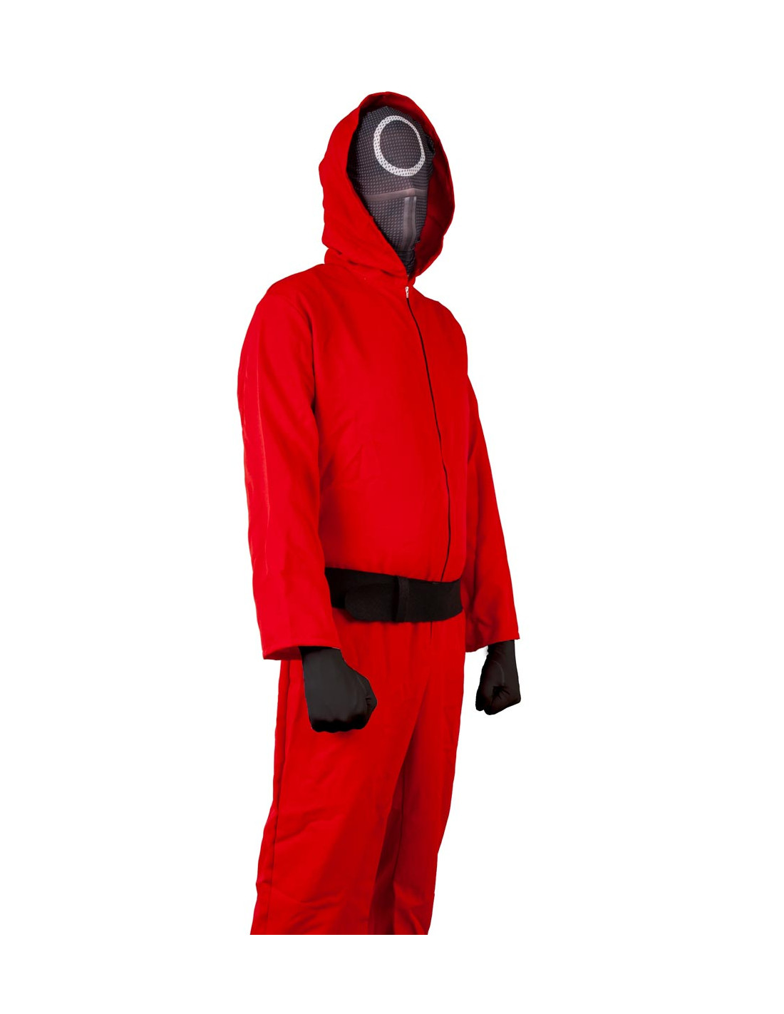 Disfraz Juego del Calamar triángulo círculo adulto que incluye máscara de tela estampada, mono y cinturón.