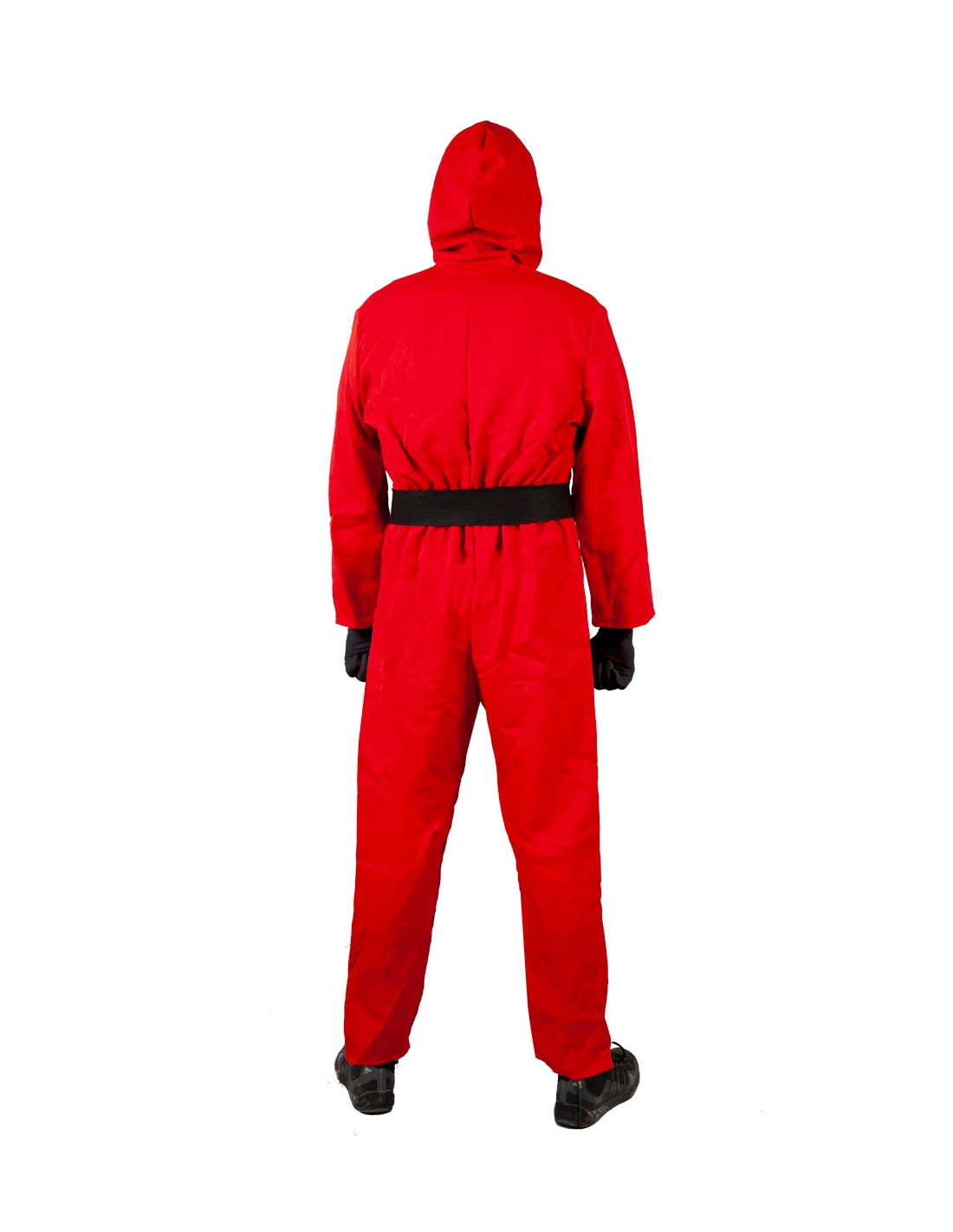 Este original disfraz Juego del Calamar triángulo círculo para adulto contiene un mono rojo con cremallera frontal, cinturón negro y máscara de tela estampada por delante y por detrás. En un lado lleva estampado el triángulo y en otro el círculo para que elijas tu rol en este juego.