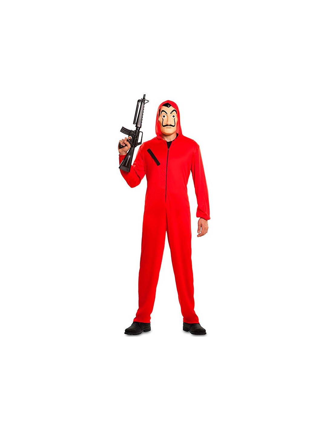 Este disfraz La Casa de Papel contiene un mono rojo con cremallera en la parte frontal y una careta de plástico.