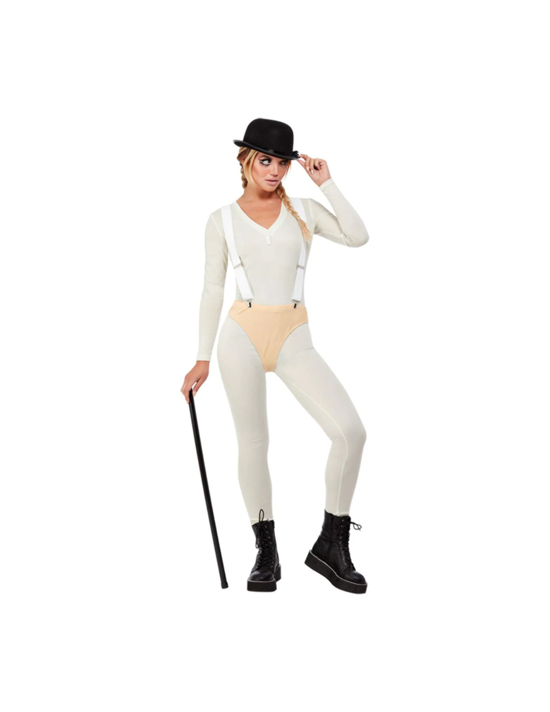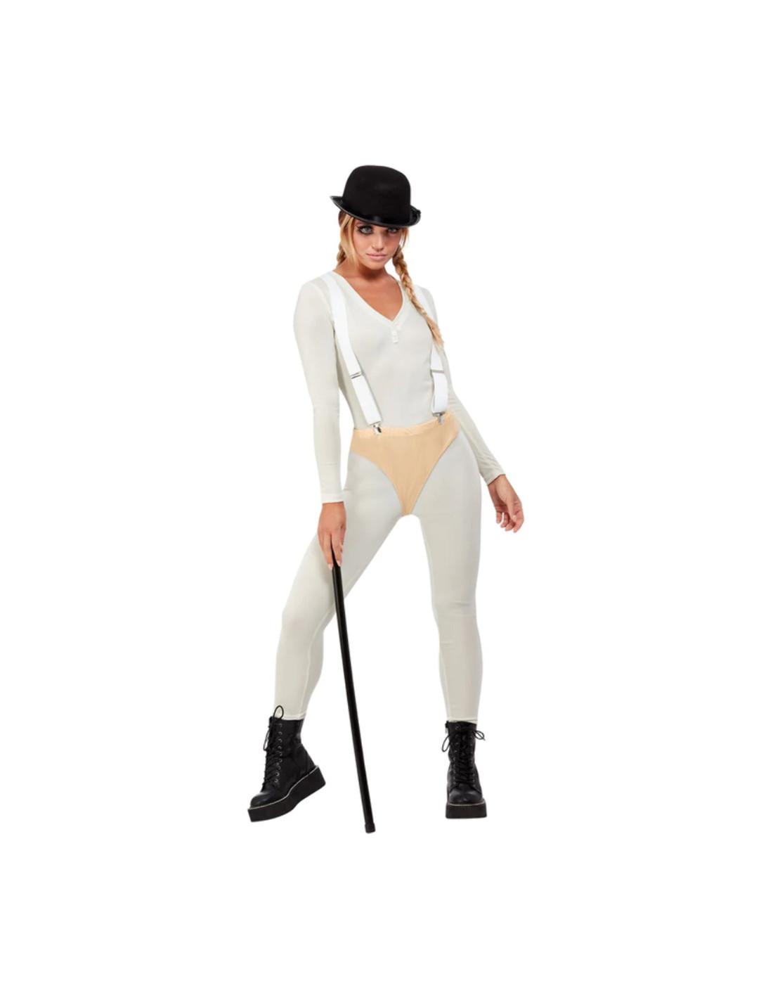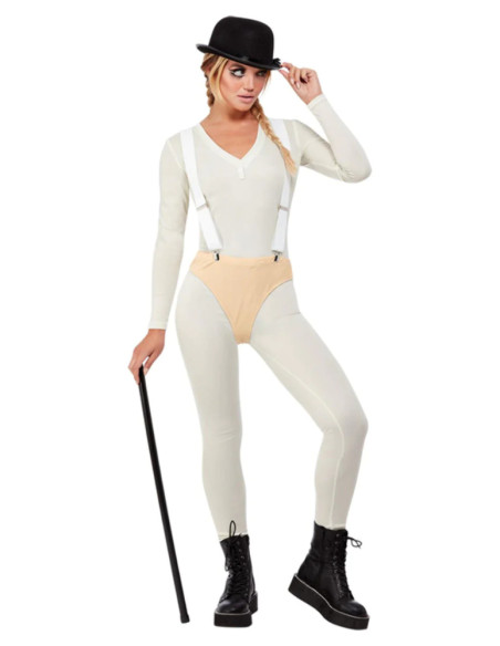 Disfraz la naranja mecánica mujer que incluye mono, slip, tirantes y sombrero.