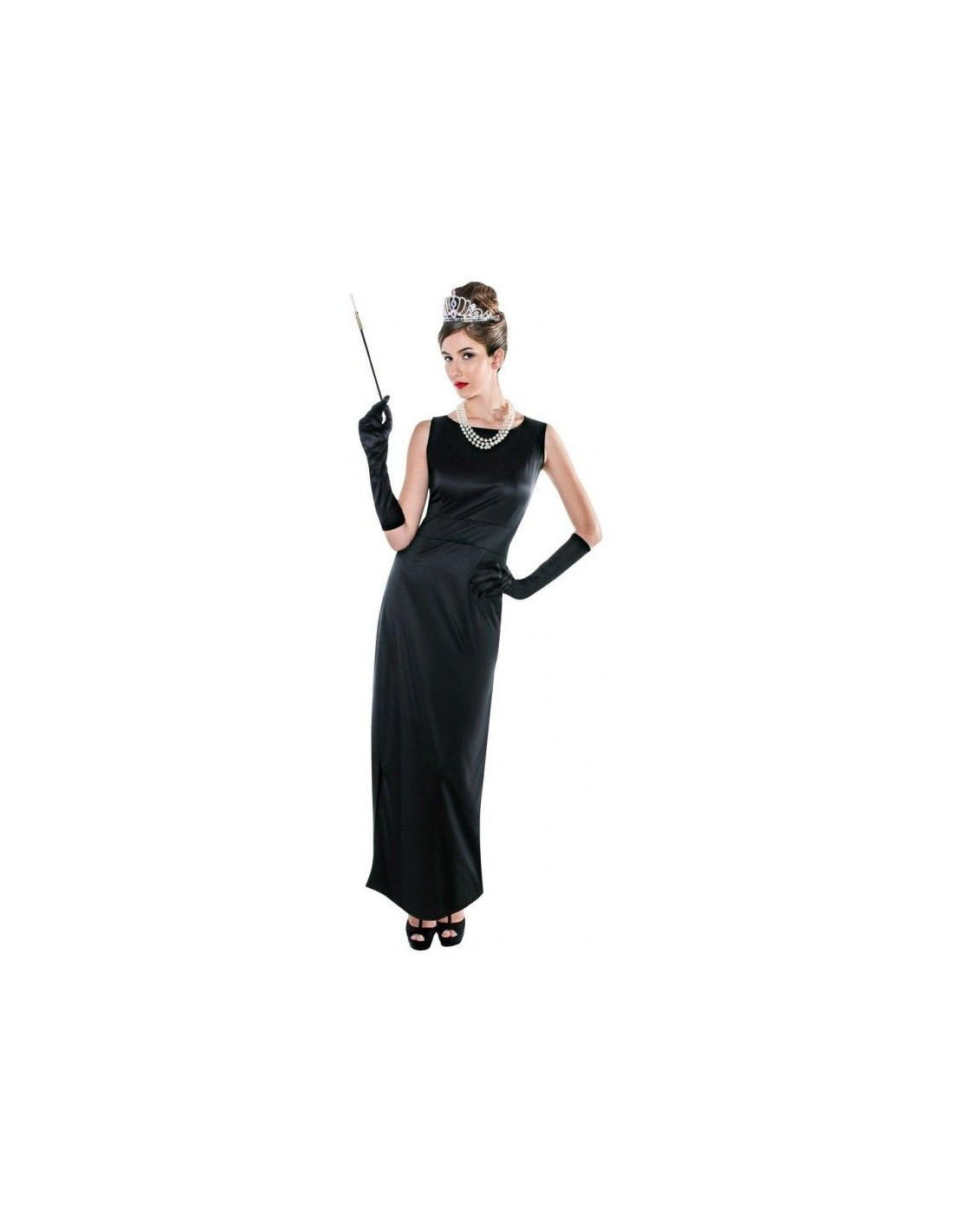 El disfraz Lady diamantes para mujer contiene un vestido largo negro y guantes largos negros.