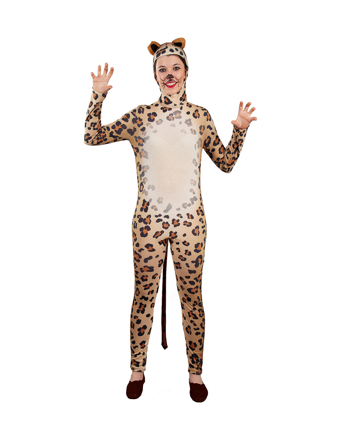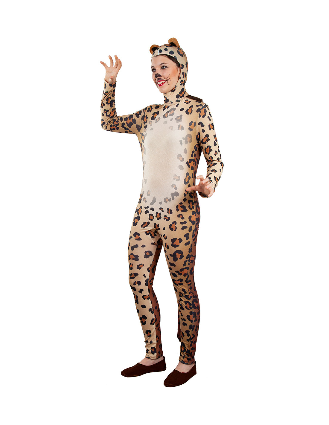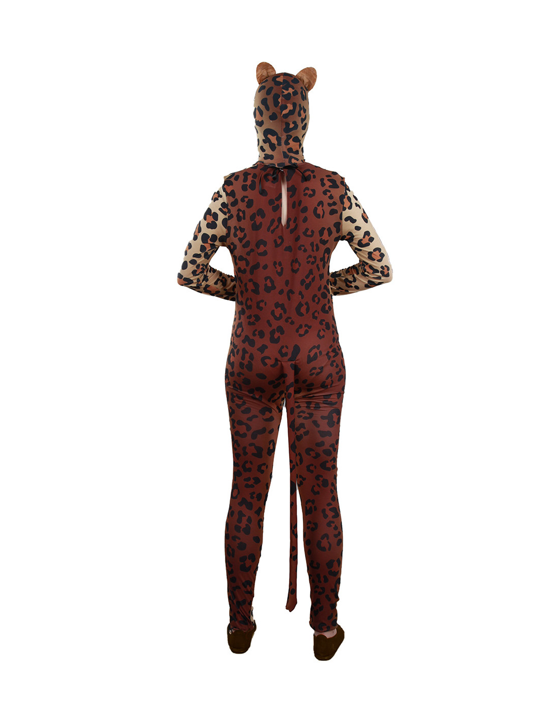 Disfraz leopardo para adulto que incluye mono estampado elástico con cola y capucha.
