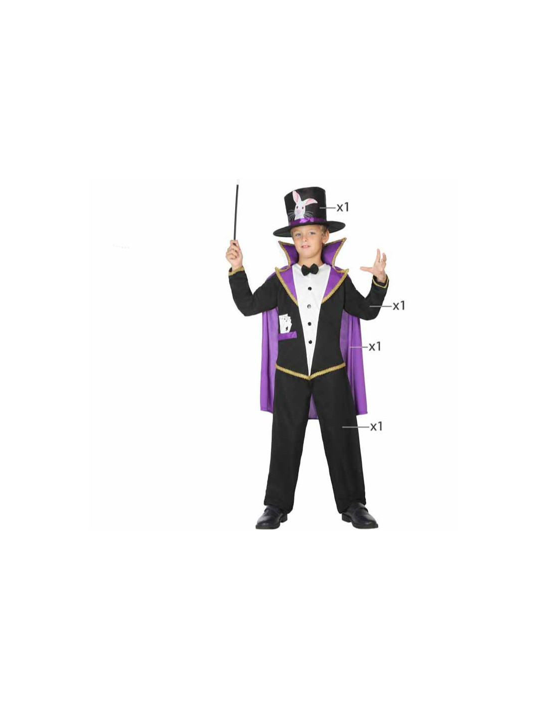Disfraz Mago ilusionista infantil, ideal para Carnaval. Incluye del pack: 1 pantalón,1 casaca,1 capa 1 gorro. No incluye pajarita y varita.