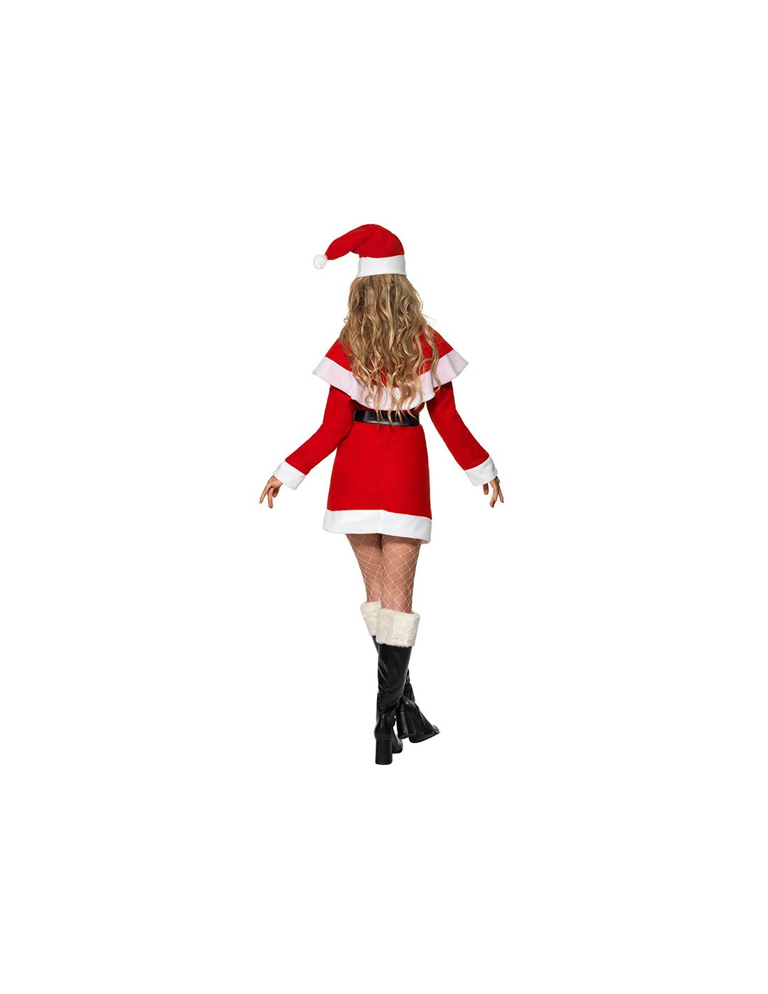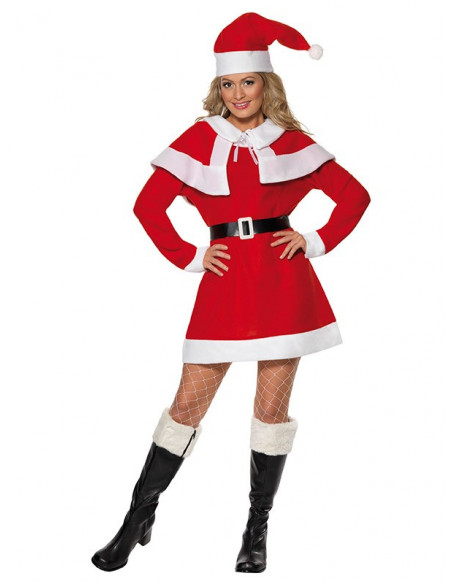 Este disfraz Mamá Noel para mujer incluye un vestido rojo con mini capa sobre los hombros, cinturón negro y gorro.
