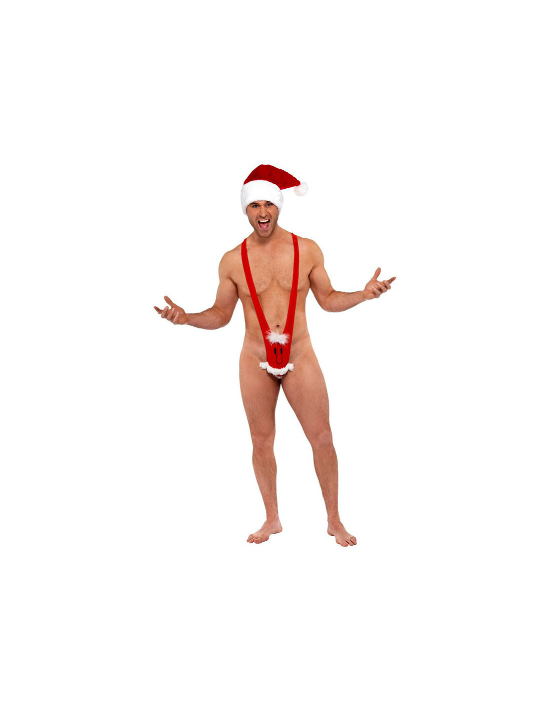 Disfraz Mankini Borat de Papá Noel que incluye un tanga rojo con una cara.