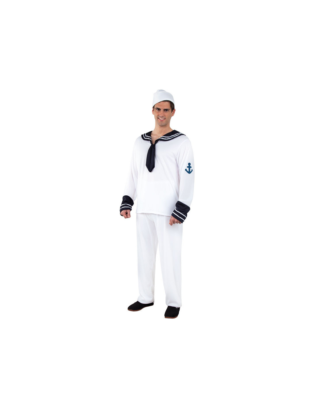 Disfraz marinero blanco para hombre que incluye gorro blanco, casaca de manga larga blanca con el cuello típico de marinero en azulón como los puños y decorado con cinta blanca, en una manga lleva estampada una ancla y pantalón largo blanco.