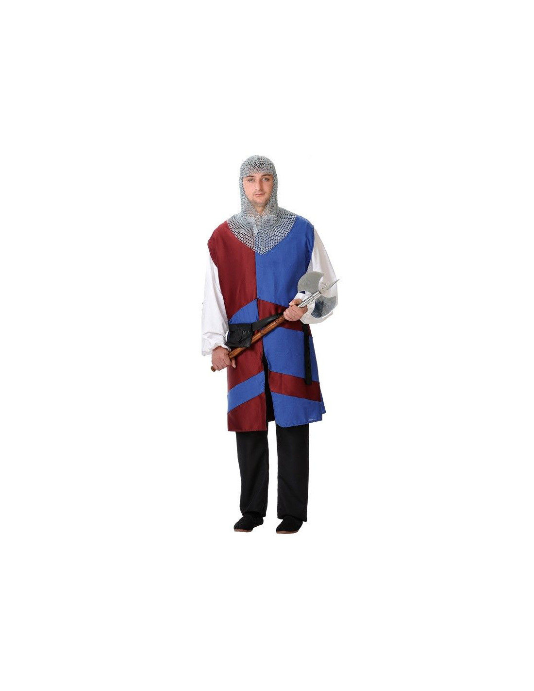 Traje medieval de Lancero para recreaciones medievales. Incluye túnica bicolor (azul y granate) , blusa blanca, pantalón y cinturón-cartera ideal para poder llevar tus objetos personales.