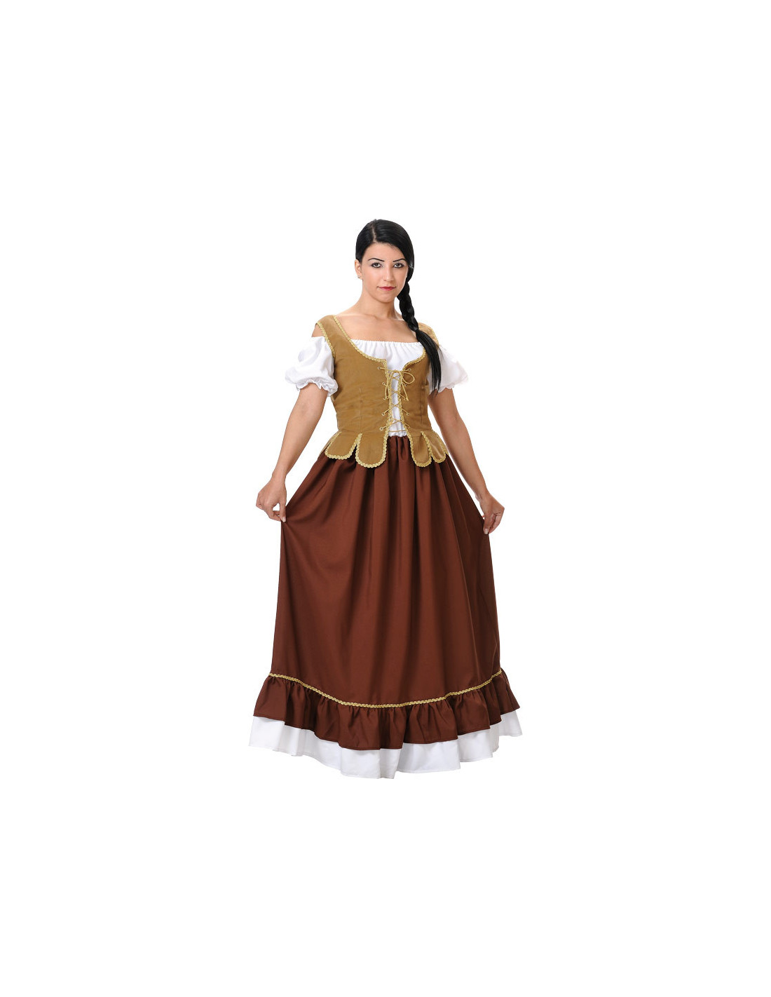Traje medieval de tabernera, que incluye: Vestido con falda color granate/teja, cuerpo de camisa blanco y corpiño en ocre. Muy cómodo de llevar en épocas de calor.
