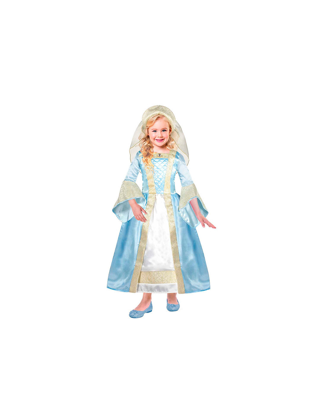Este completo disfraz medieval Tudor para niña contiene un vestido azul claro de Tudor con un hermoso adorno de jacquard dorado. Incluye un tocado Tudor con velo. 95% poliéster, 5% nylon