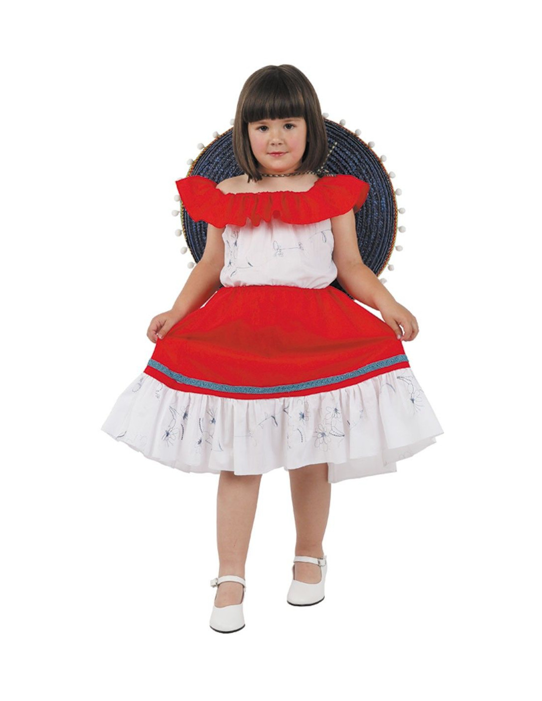 El traje incluye blusa y volante de falda en tejido de popelin bordado y el resto de la faldaen tejido rojo de poliester decorado con una pasamaneria. No incluye sombrero. Baila  al son de los mariachis con este precioso disfraz de mejicana. tambien te sirve para disfrazarte de paises o para festivales del colegio.