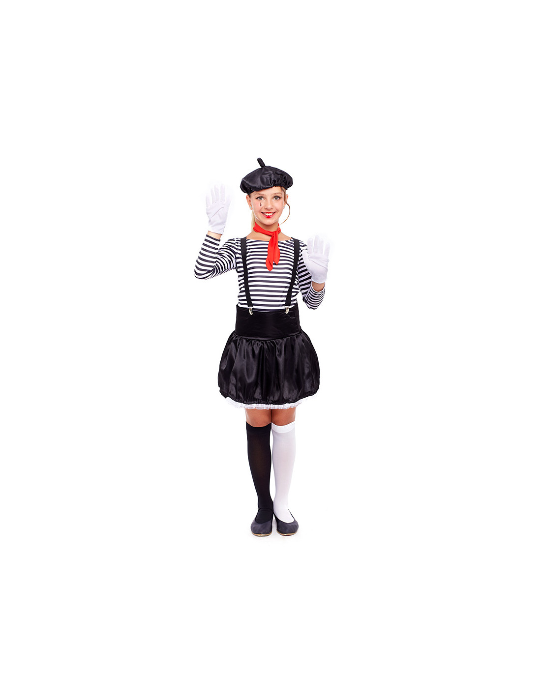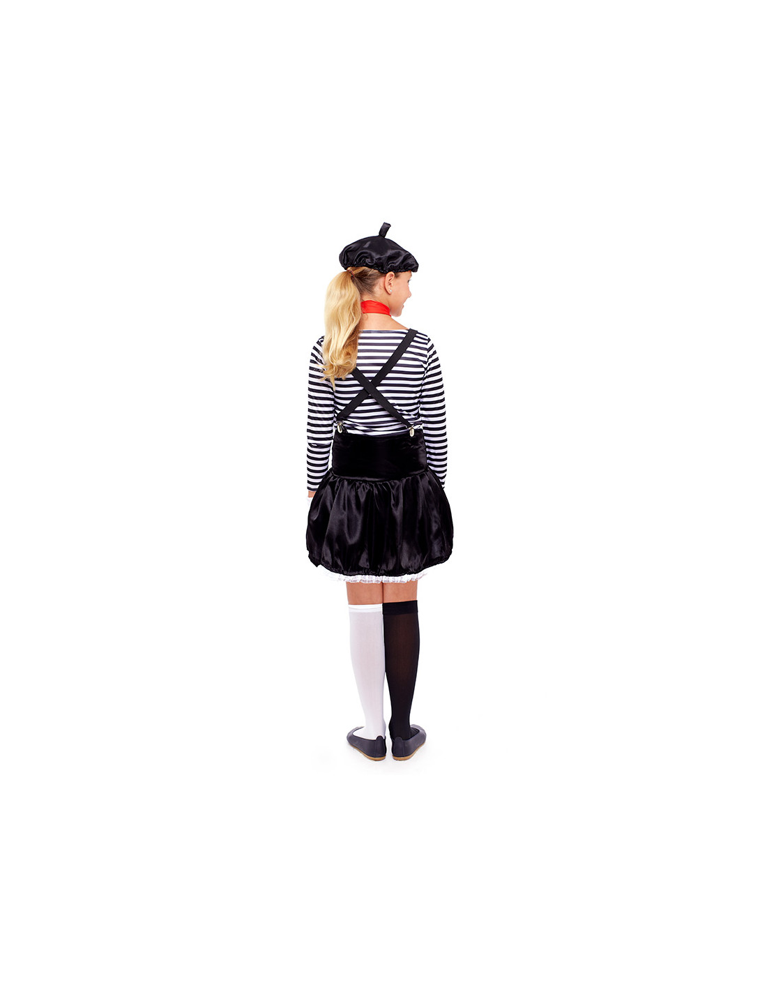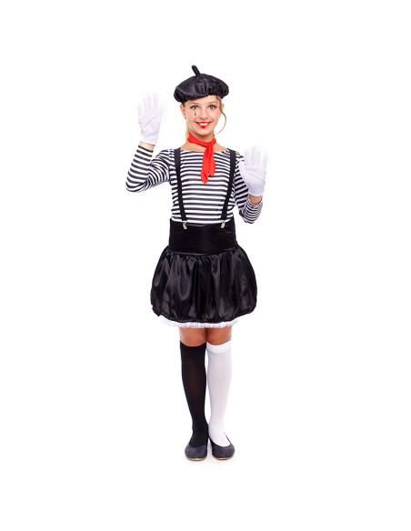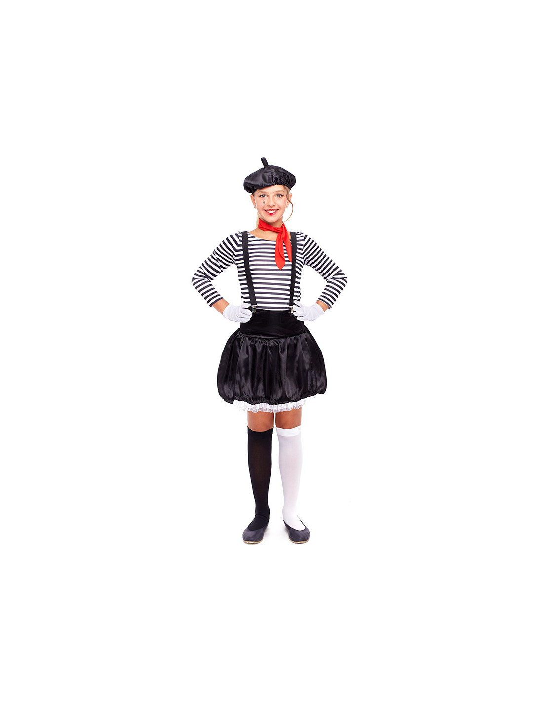 Disfraz mimo Parisina niña que esta compuesto por, boina, camiseta, pañuelo, falda, tirantes y medias.