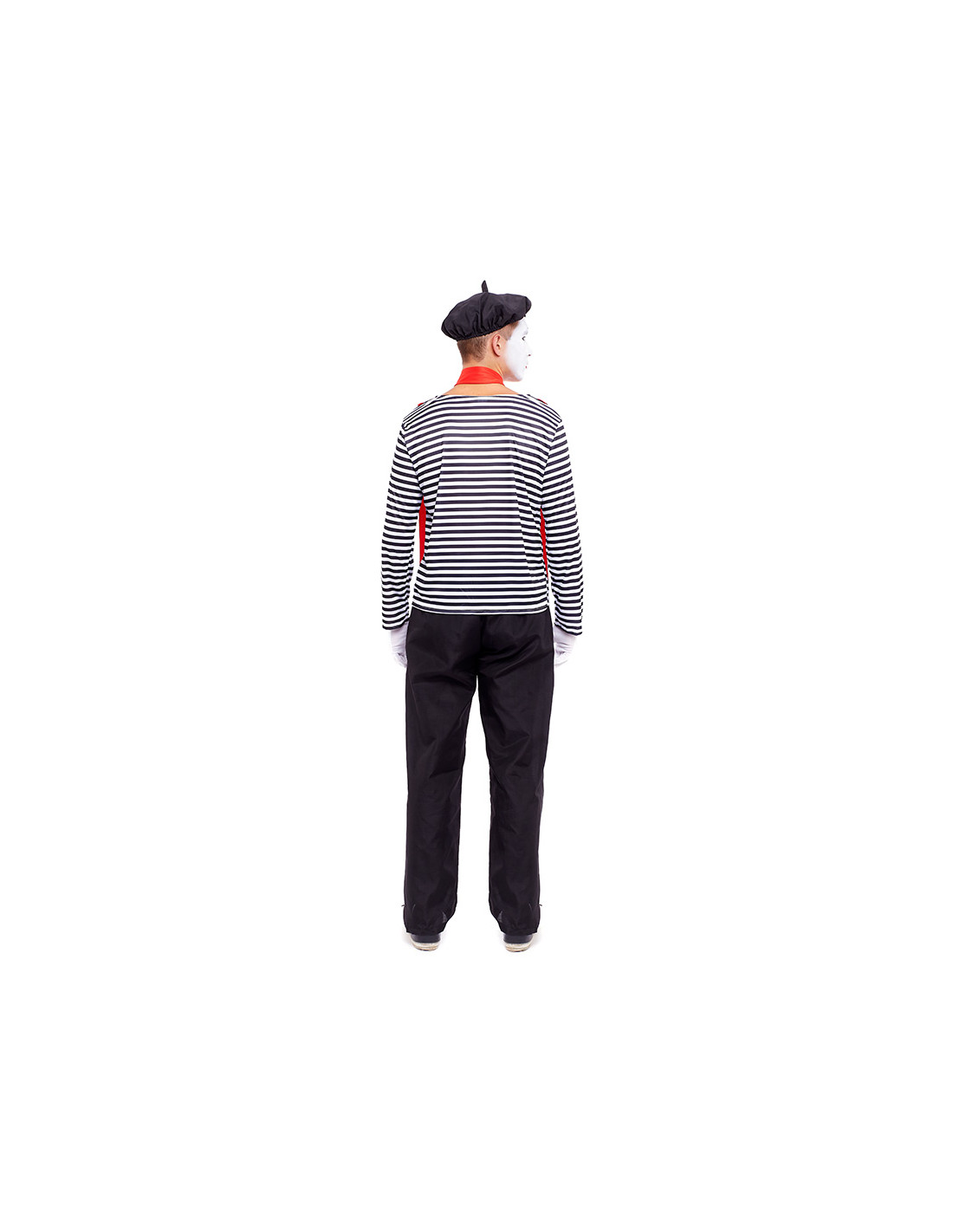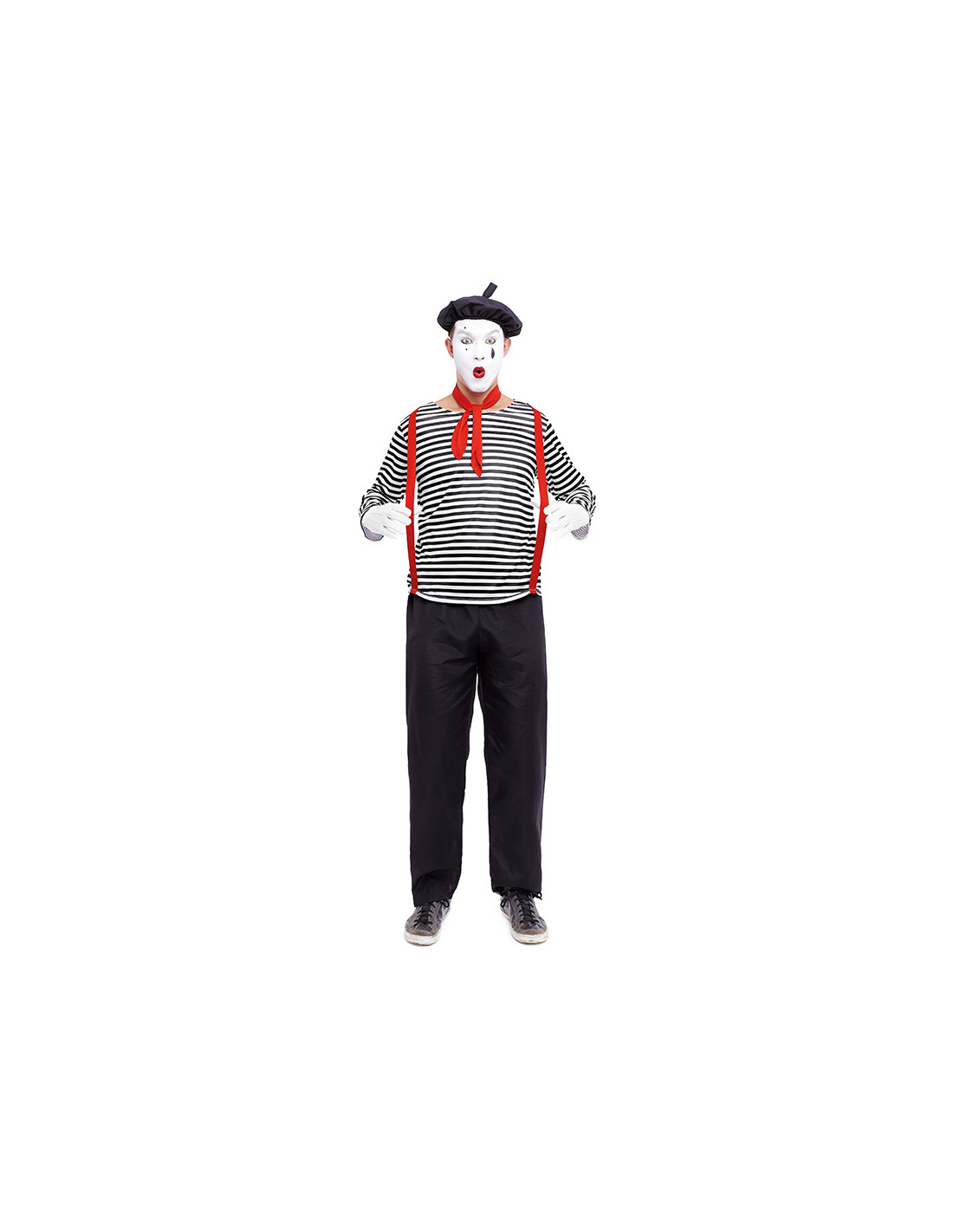 Disfraz mimo para hombre que esta compuesto por, una boina, camiseta, pañuelo, pantalón y guantes. No incluye tirantes de color rojo.