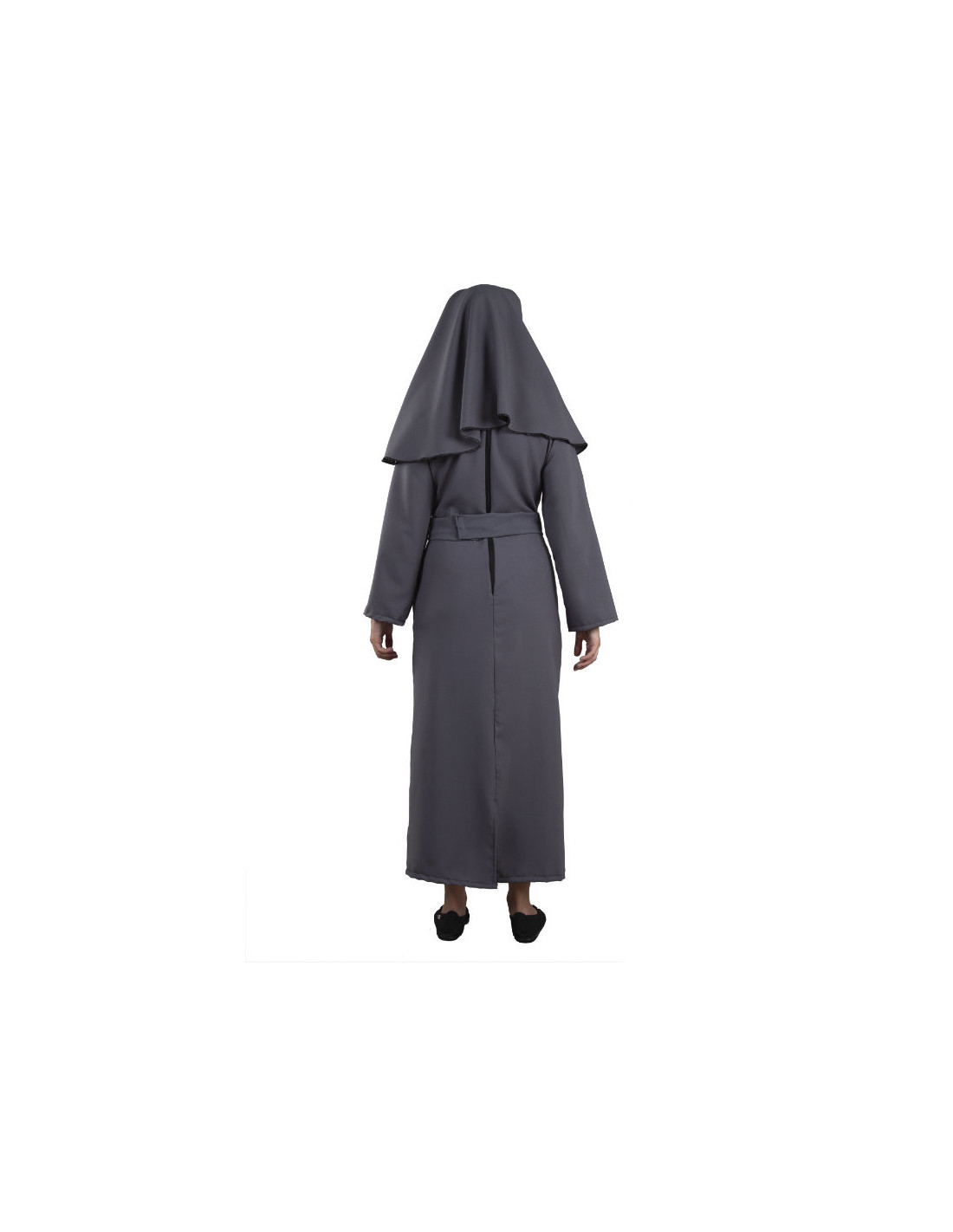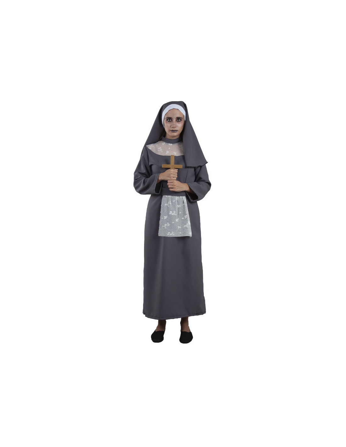 El disfraz monja sombría mujer contiene cofia gris, vestido gris y delantal con cinturón.