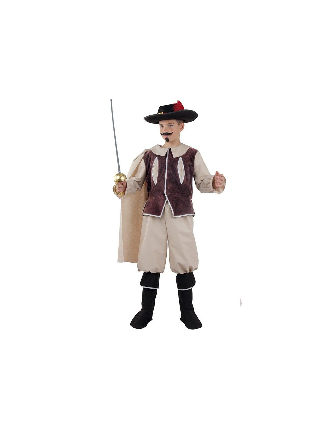 Disfraz de mosquetero para niño para gritar con sus compañeros la mítica frase "¡uno para todos y todos para uno!"-. Incluye un elegante disfraz de mosquetero para niño, compuesto por una casa en color marrón con capa beige, pantalón en el mismo color de la capa y cubrebotas.