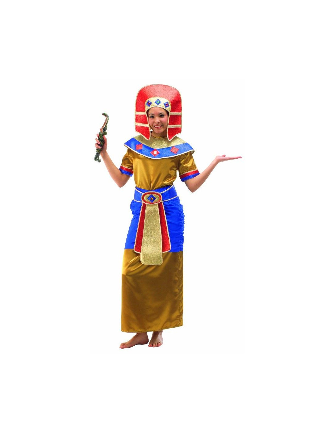 Disfraz de egipcia, que incluye: Tunica dorada, cuello dorado y azul, cinturon, sobrefalda elastica azul y tocado de faraona. Talla unica.