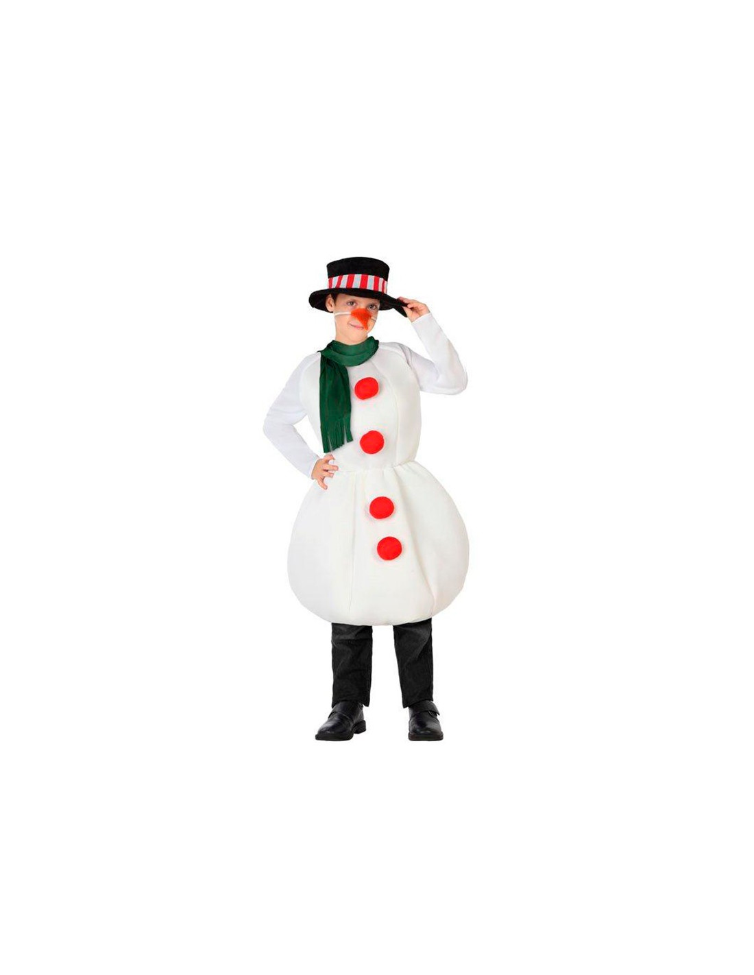 El disfraz de muñeco de nieve infantil incluye un traje blanco con pompones rojos a modo de botones, una bufanda verde, sombreros negro con cinta a rayas y nariz naranja con goma elástica. No incluye pantalón.