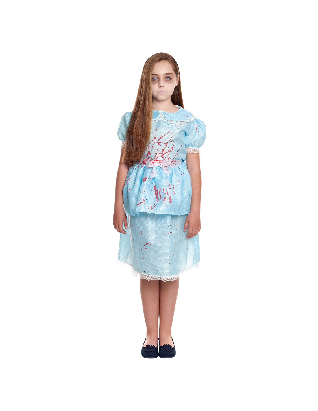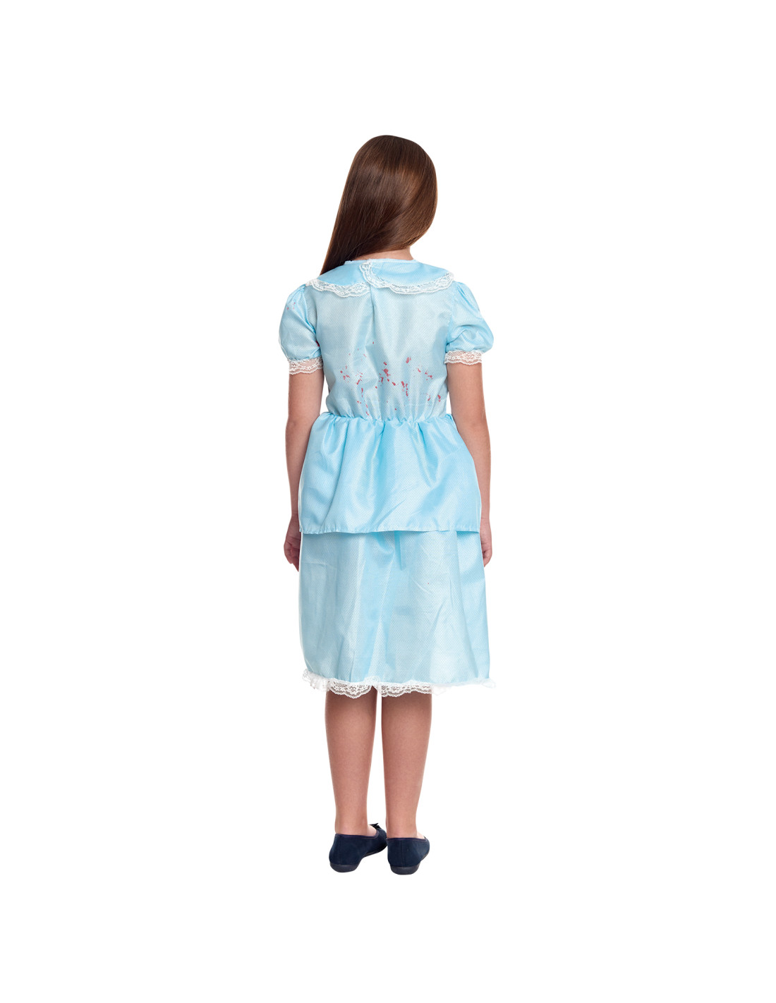El disfraz niña de El Resplandor contiene un vestido azul con manchas de sangre.