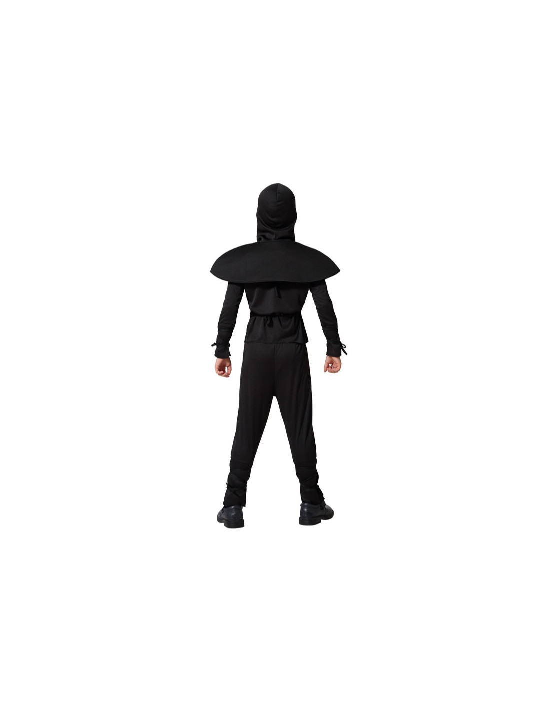 Disfraz ninja guerrero infantil que incluye camiseta, pantalón, pasamontañas, muñequeras y pechero.