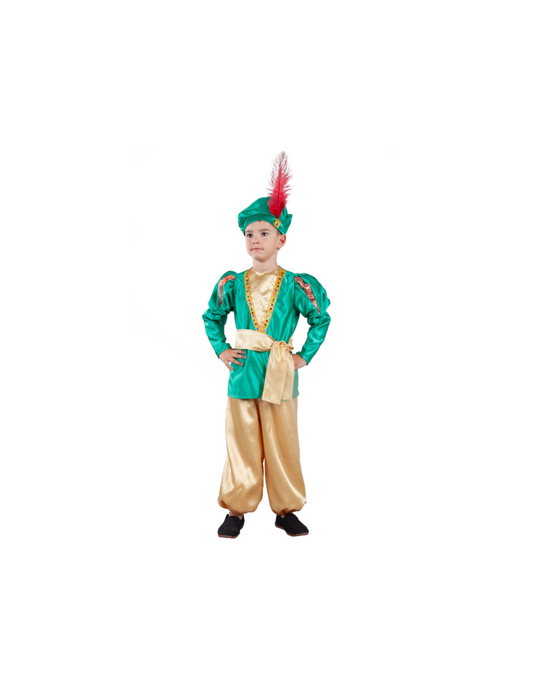 El disfraz paje verde infantil contiene una gorra verde con pluma y detalle dorado, camiseta verde con detalles dorados y mangas abullonadas hasta codos aproximadamente, cinturón dorado y pantalón de la misma tela con cintura elástica y efecto bombacho.