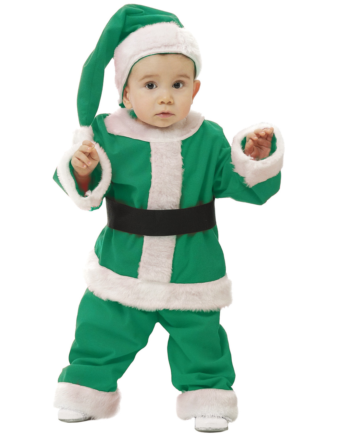 Disfraz Papa Noel verde infantil que incluye chaqueta, pantalón, cinturón y gorro.