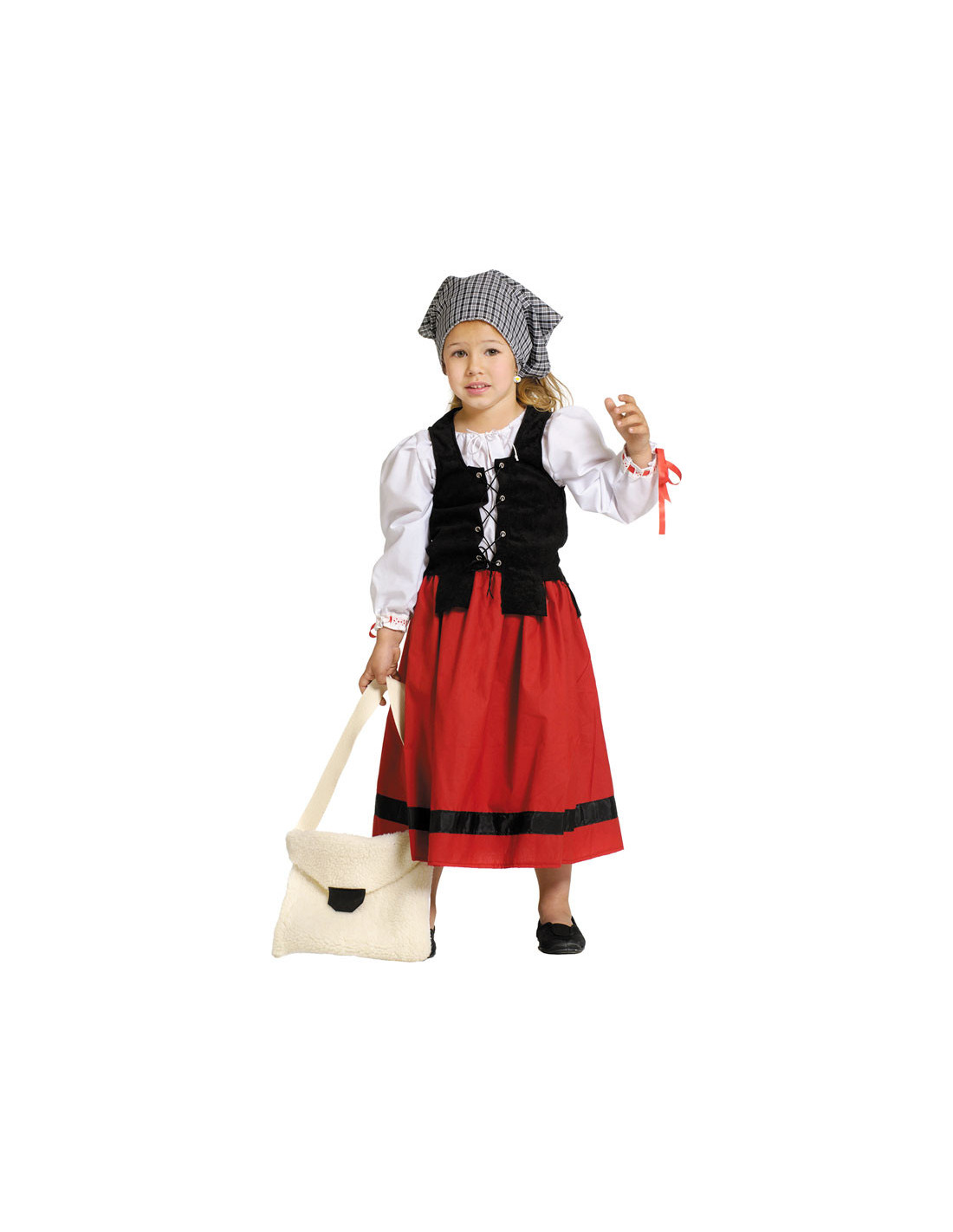 Incluye camisa y falda en tejido de poliester decorada con una franja de raso, chaleco de antelina, zurrón de borreguito y pañuelo. Disfraz pastora niña con el que disfrutarás participando en el belén de tu colegio o parroquia, o como trajes regionales sin el zurrón.