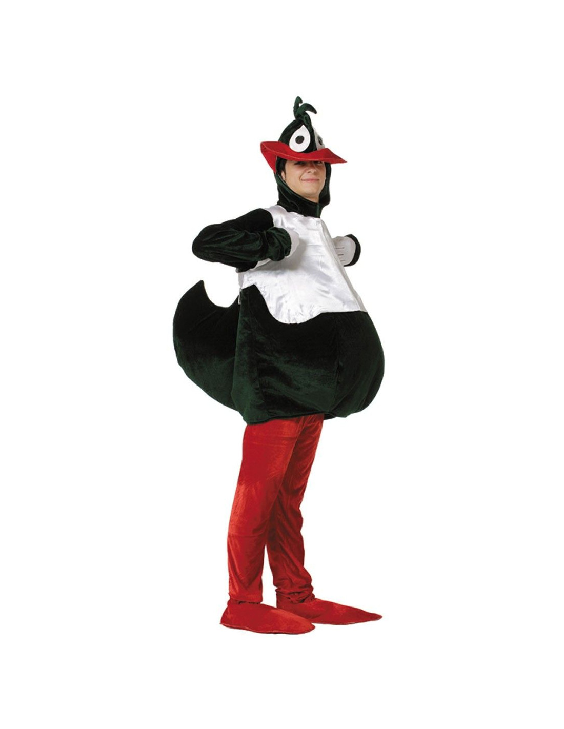 Disfraz de pato hombre incluye cabeza con detalles de cresta, ojos y boca en colores verde oscuro y rojo, cuerpo verde oscuro con volumen en la barriga y cola, chaleco blanco de raso, pantalon rojo y cubre pies. Todo el disfraz esta fabricado en velus menos el chaleco.