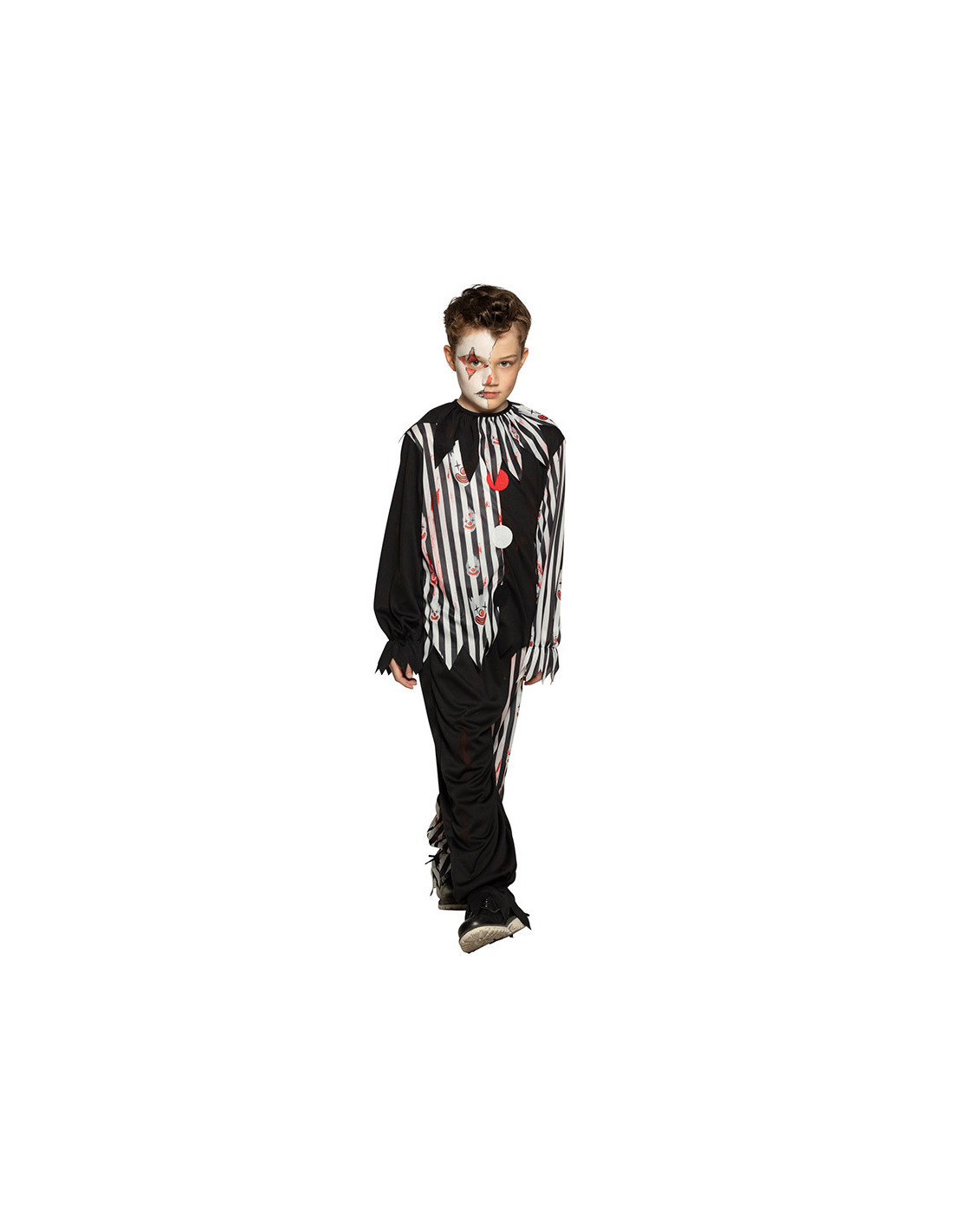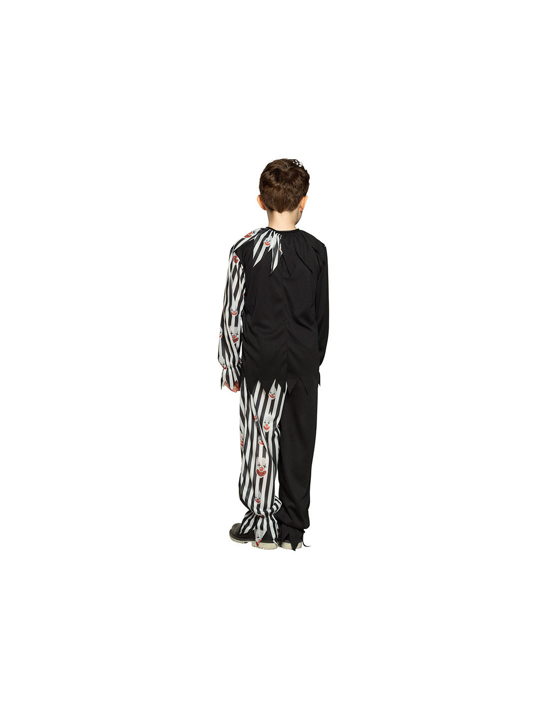 El disfraz payaso diabólico infantil contiene cuello de tela, camisa y pantalones. Todo ellos en color negro y rayas blancas y negras.