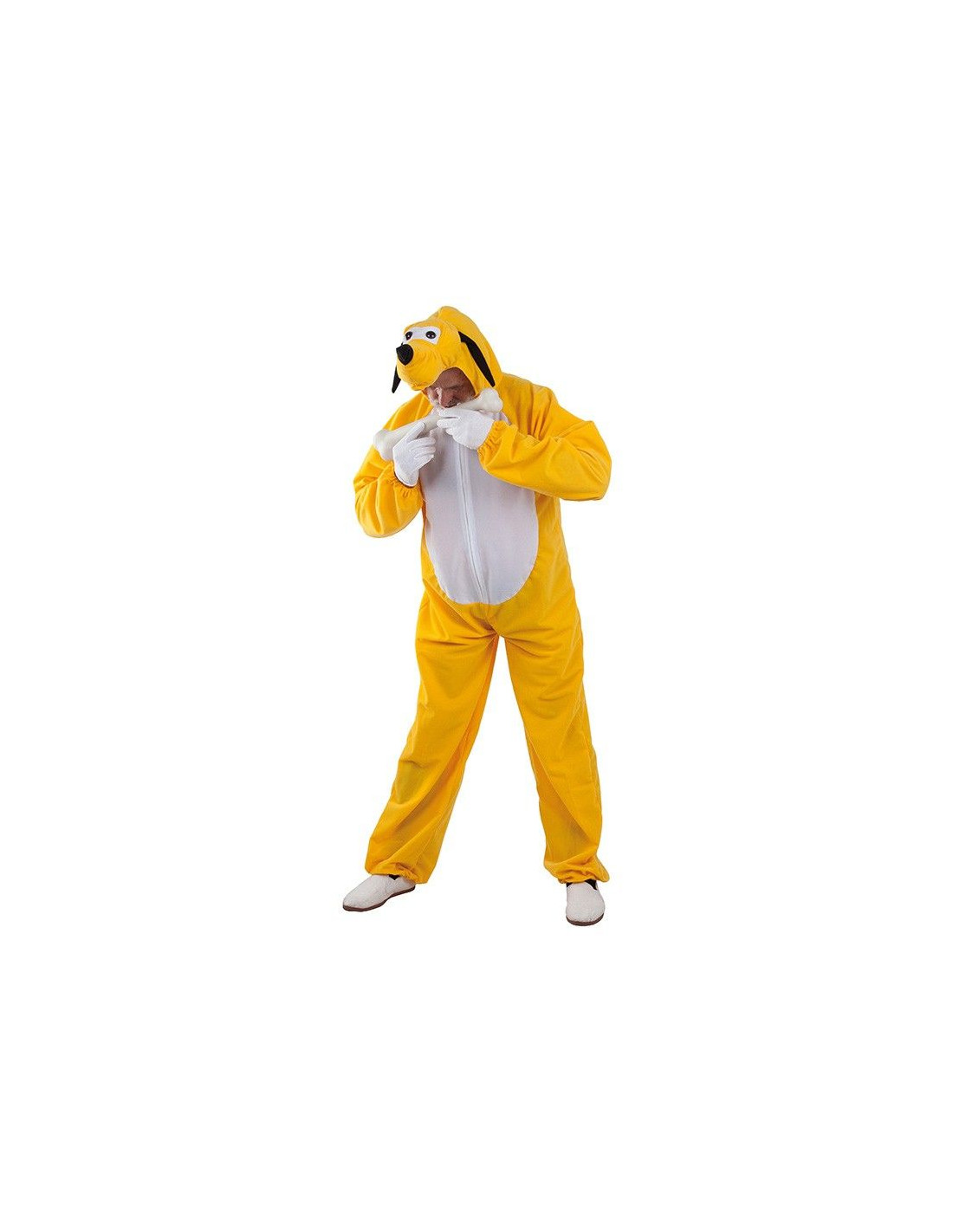 Disfraz perro Pluto hombre que incluye mono con cabeza de color naranja y pecho blanco, el traje esta fabricado con tejido velux, dispone de una cremallera en el pecho y la cabezatiene los detalles de las orejas, ocico y ojos.