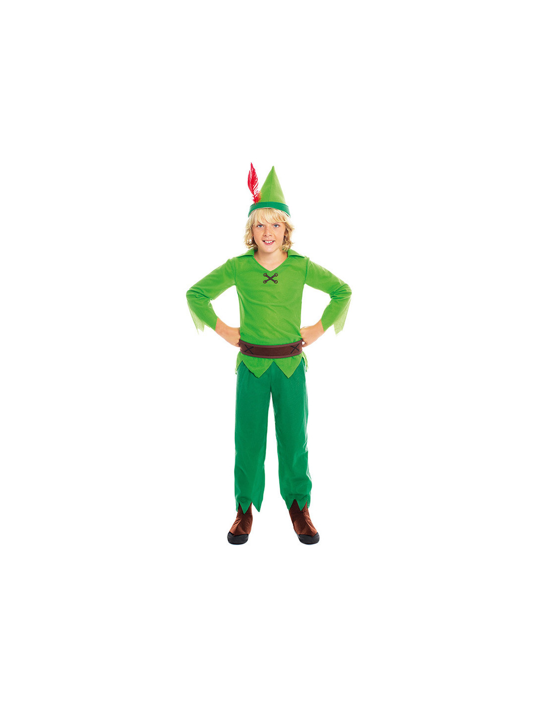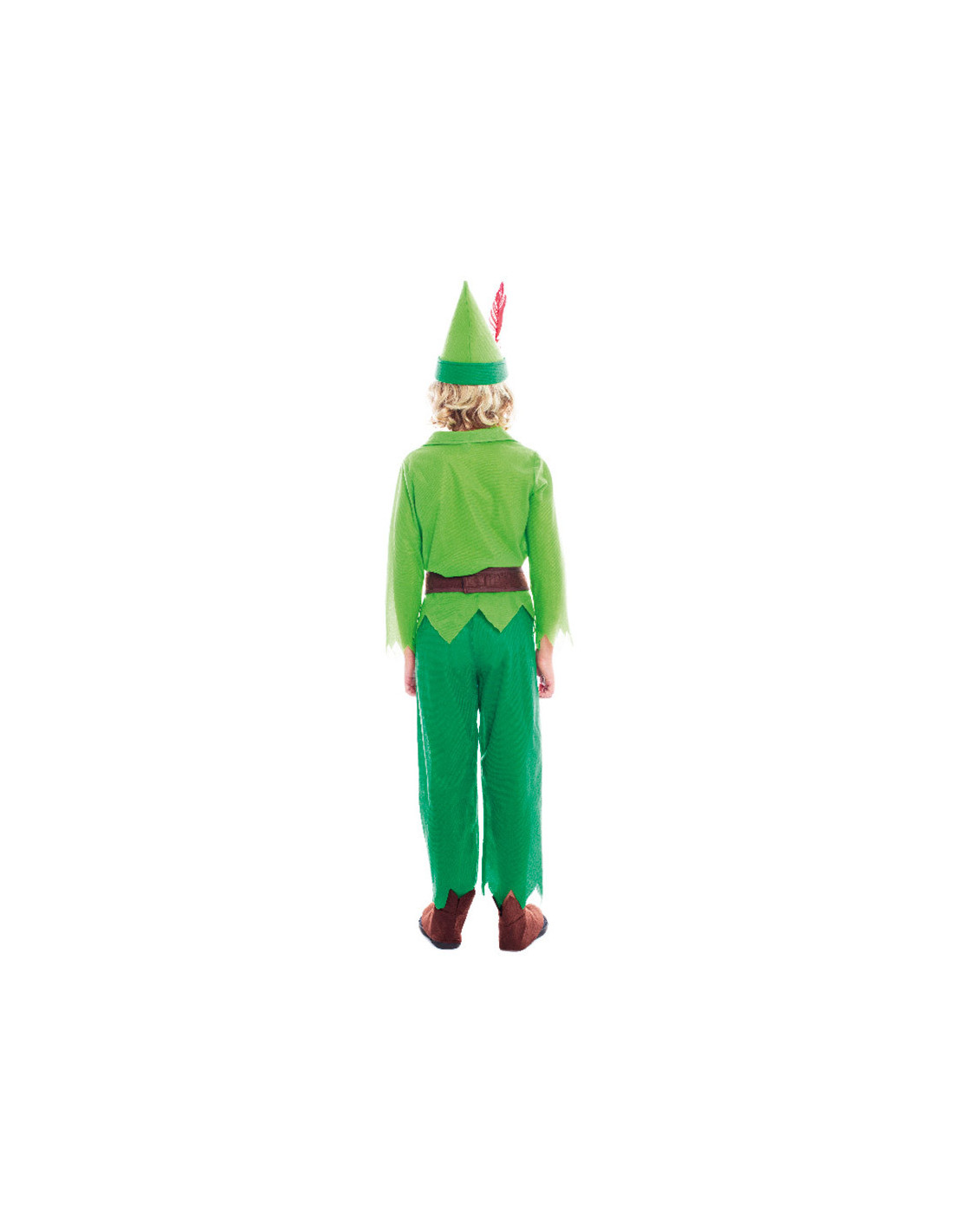 Este completo disfraz Peter Pan verde infantil incluye gorro con pluma, camiseta, pantalón, cinturón marrón con velcro y cubrebotas marrones.