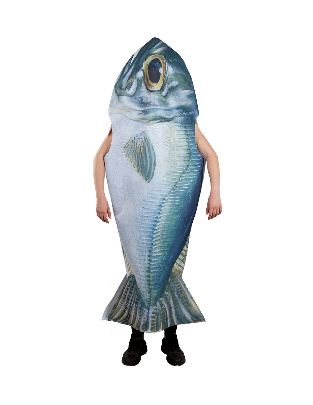 El disfraz consta de un traje de cuerpo entero con forma de pez y espacio para sacar los brazos. El ojo situado en la parte frontal es de tela semitransparente para que puedas ver a través de ella de forma cómoda.