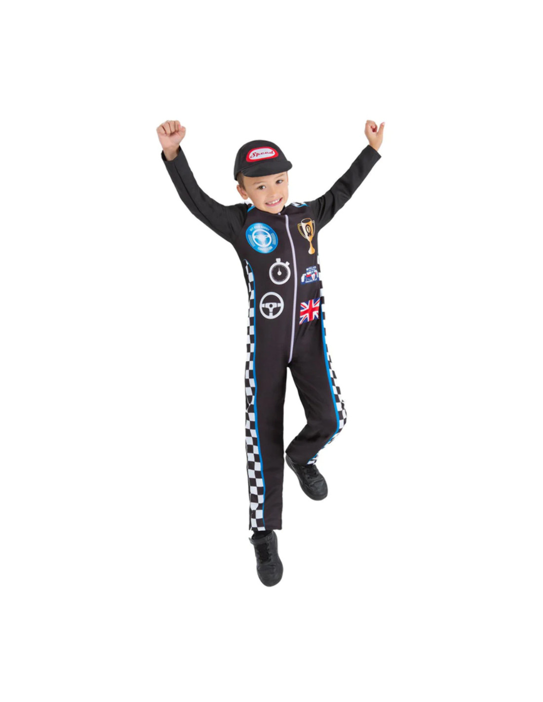 Disfraz piloto de carreras infantil que incluye mono y gorra.