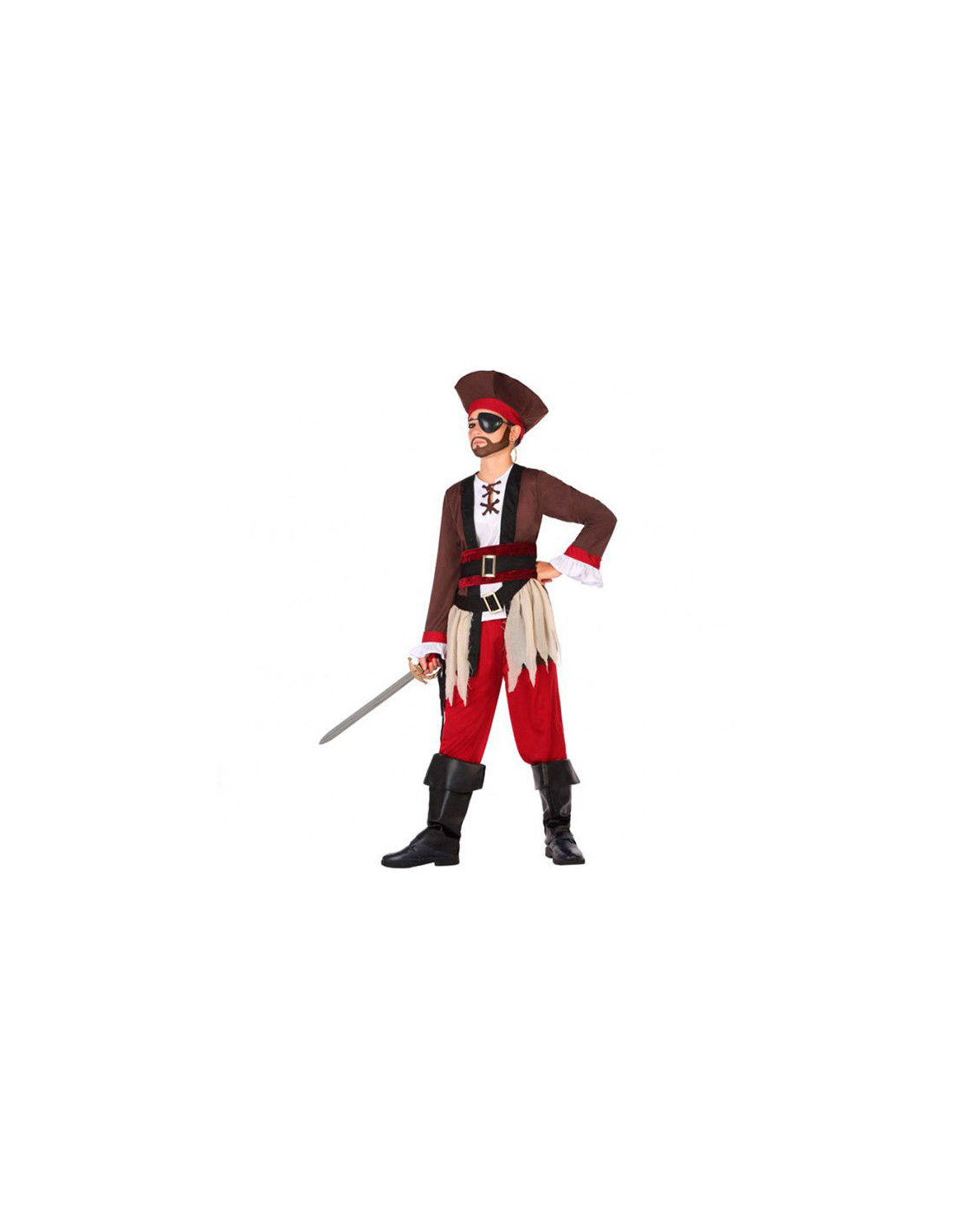 Disfraz pirata bandido para niño que incluye chaqueta con camisa simulada, pantalón, gorro y cinturones.